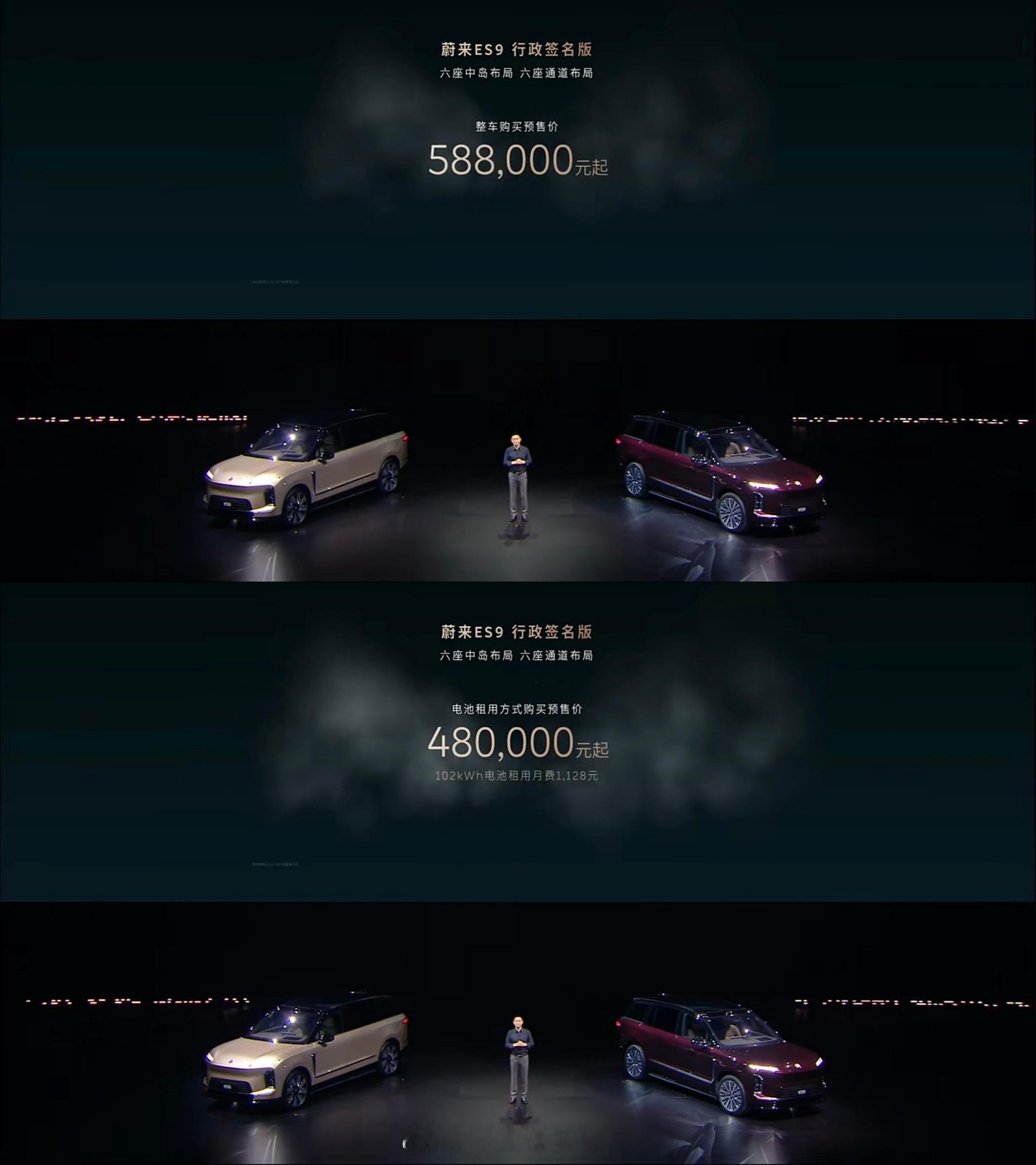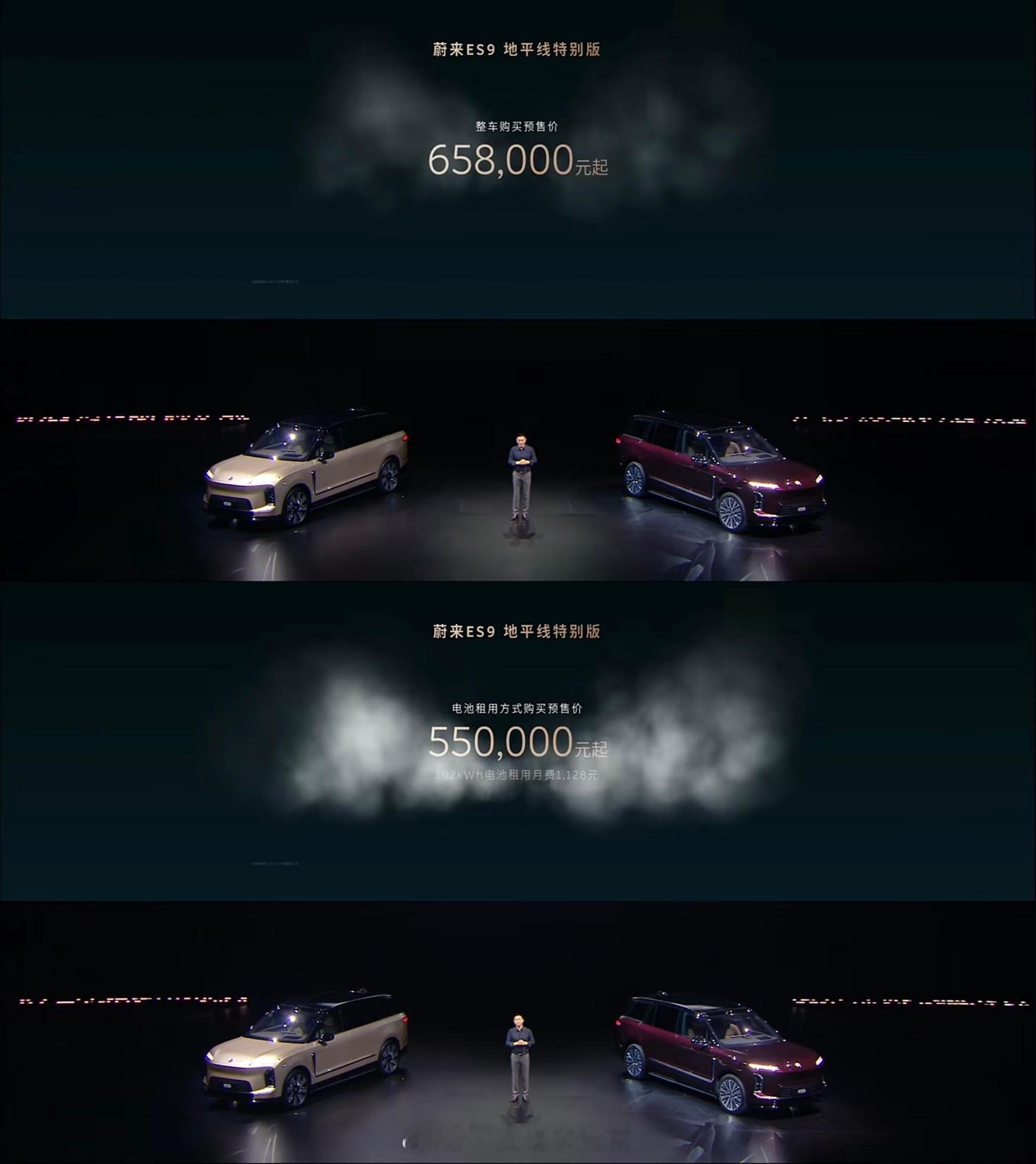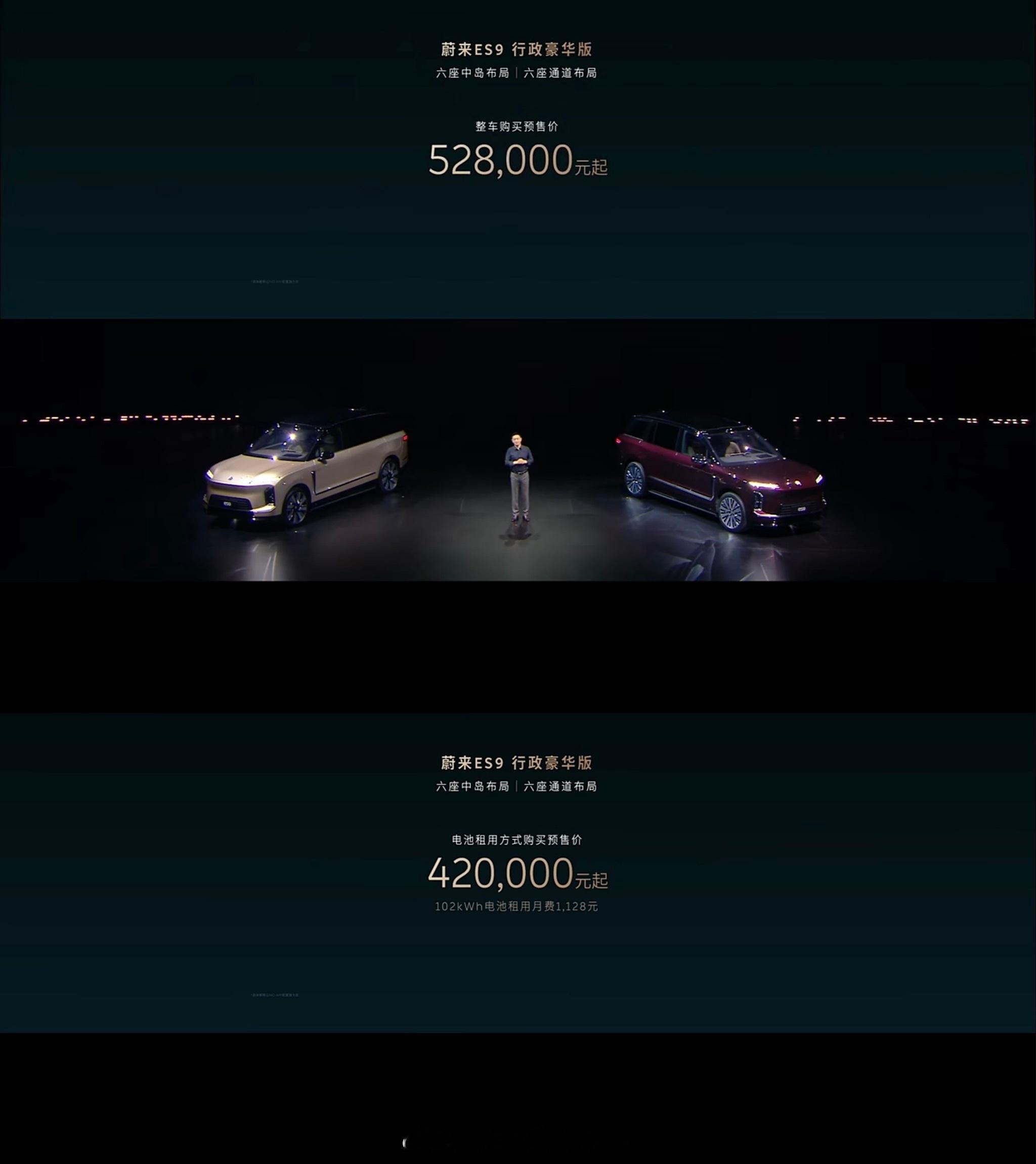 蔚来ES9分三个版本:豪华版52.8万,租电42万签名版58.8万,租电48万地平线版65.8万,租电55万预付定金5000可以顶10000