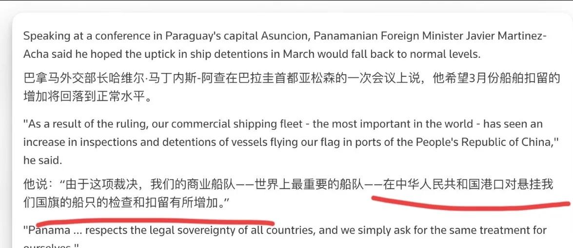 感到疼了!巴拿马对我们喊话!4月9日,根据外媒报道,巴拿马外交部长喊话称,中国对悬挂巴拿马国旗的船舶加强检查和扣留,就是源于巴拿马法院针对香港长和作出的裁决,我们希望中国尊重巴拿马的主权事务。巴拿马尊重所有国家的法律主权,我们只是要求一视同仁。