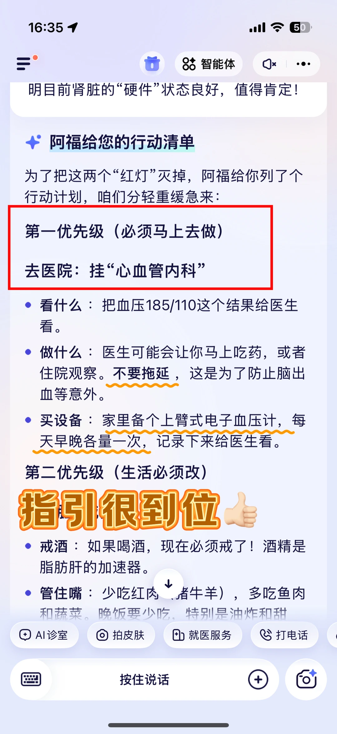 阿福给的处理意见也优先级明确,先挂号、再改善生活习惯,交代得清清楚楚的。