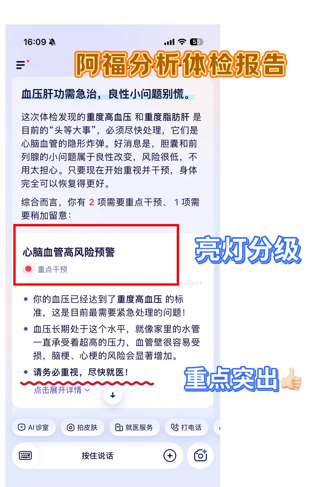 总之,看完阿福分析的体检报告,很多事情不用我再跟老头子一遍遍交代了。慢性病管理拼的是长期战,让阿福读读体检报告,把身体科学管起来,没有广告,分析有理有据,想省心直接给爸妈也安排上。