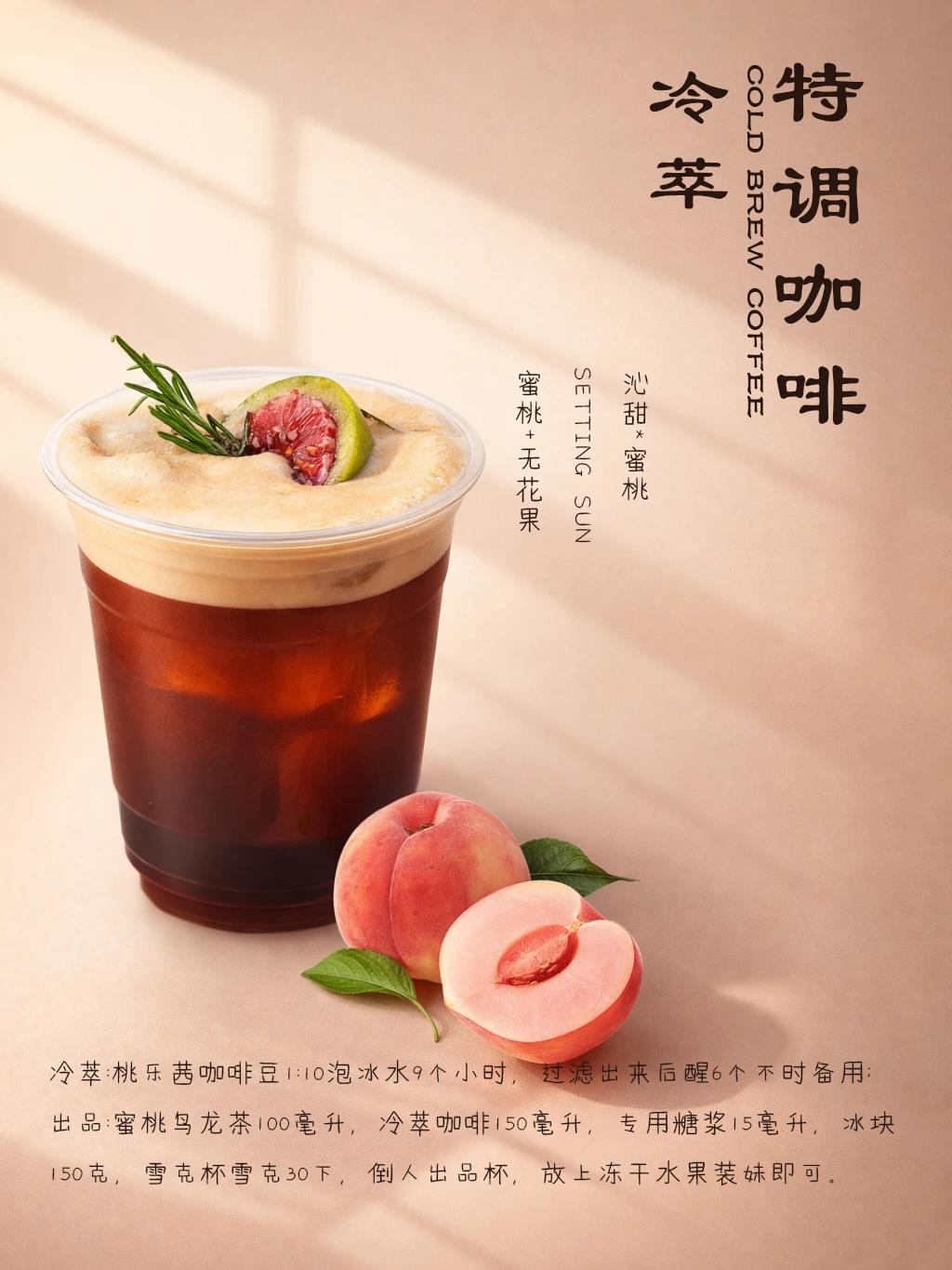 雪克杯加入蜜桃乌龙茶、冷萃咖啡、专用糖浆和冰块。
