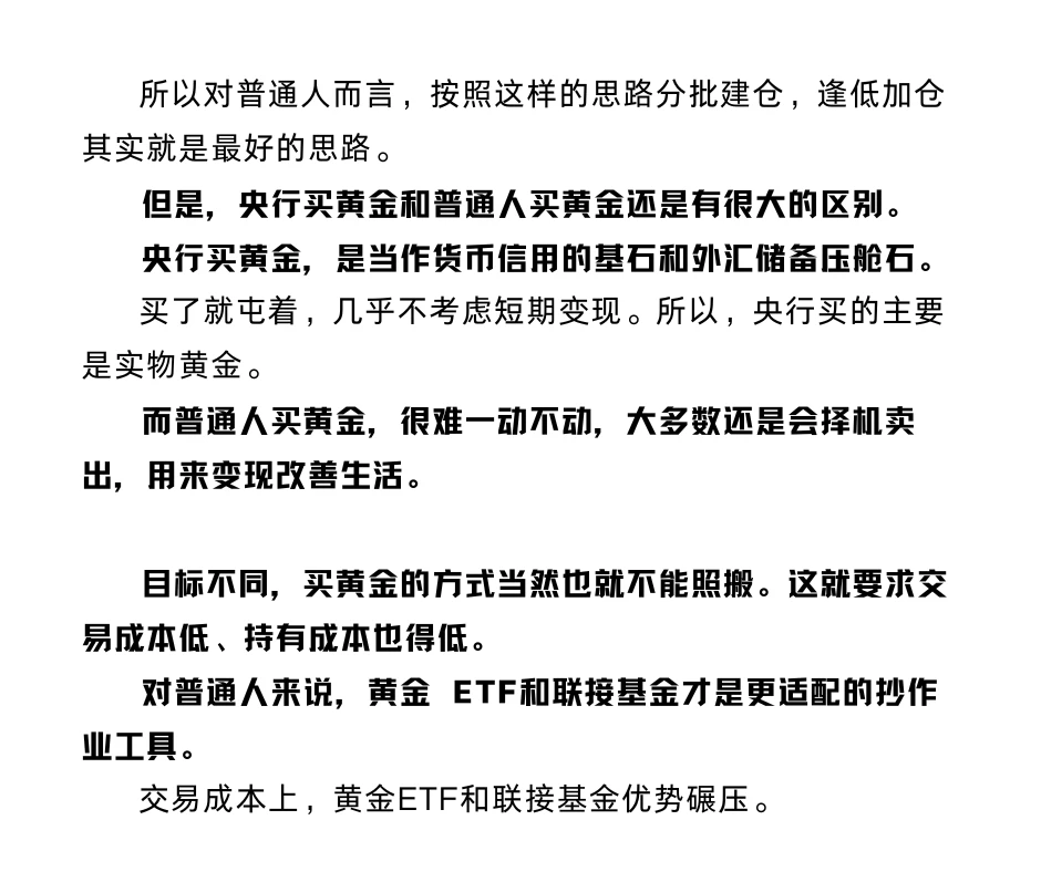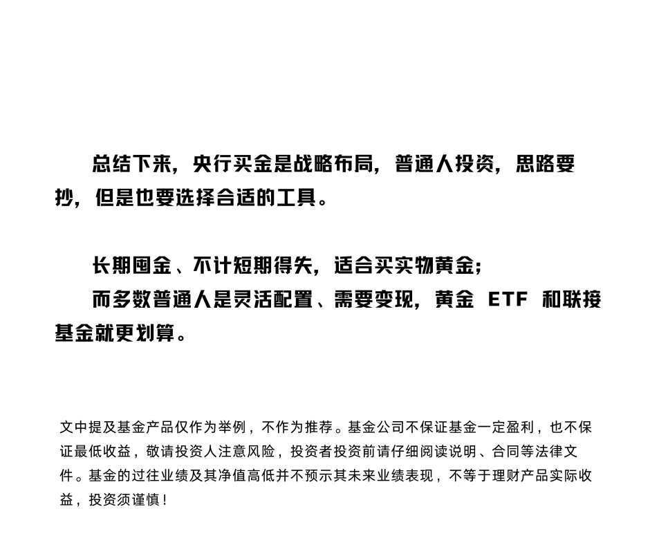 总结下来央行买金是战略布局,普通人投资,思路要抄,但是也要选择合适的工具。长期囤金、不计短期得失,适合买实物黄金;而多数普通人是灵活配置、需要变现,黄金 ETF 和联接基金就更划算。