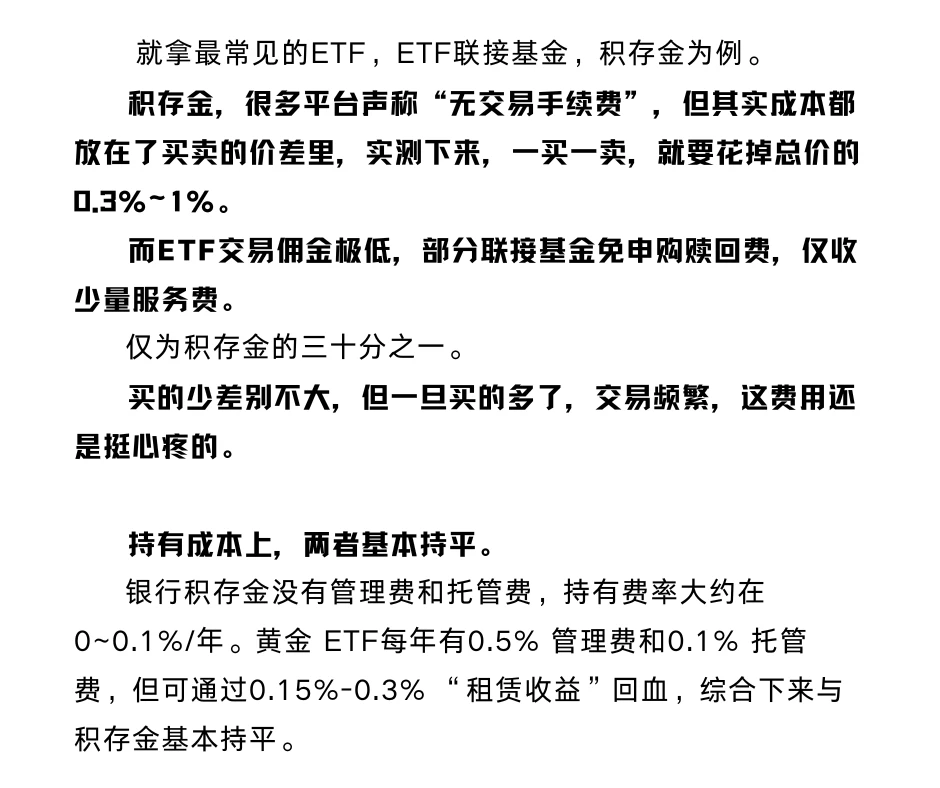 交易成本上,黄金ETF和联接基金优势碾压。就拿最常见的ETF,ETF联接基金,积存金为例。很多平台声称“无交易手续费”,但其实成本都放在了买卖的价差里,实测下来,一买一卖,就要花掉总价的0.3%~1%。