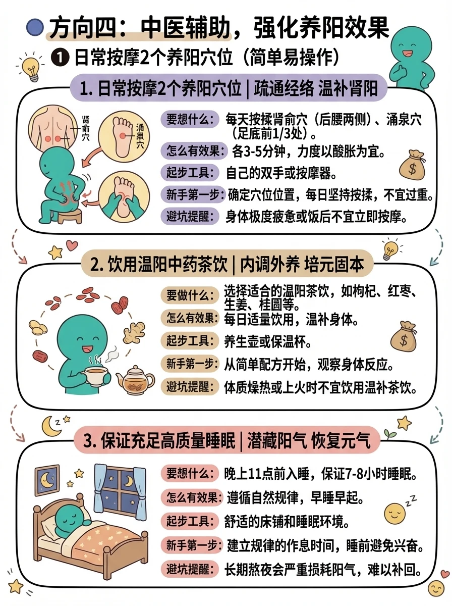 早餐热粥+鸡蛋启动阳气;下午核桃+红枣补能;每周1-2次羊肉汤温补。