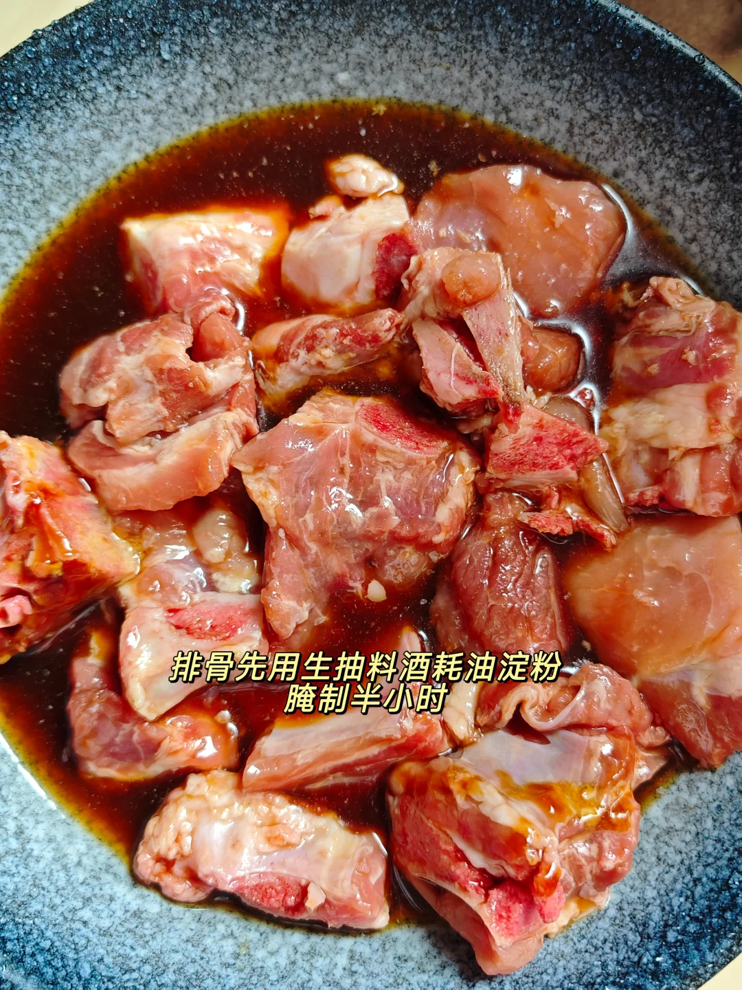 1⃣️各种食材准备好,切好;排骨洗干净后用生抽料酒耗油淀粉腌制半小时!