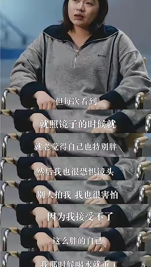 她说:“每次看到就是自己照镜子的时候,就老觉得自己特别胖,然后我也特别惧怕镜头,别人拍我,我也很害怕怕,因为我接受不了这么胖的我。我那时候喝水就重了,我看到体重秤就特别害怕……”