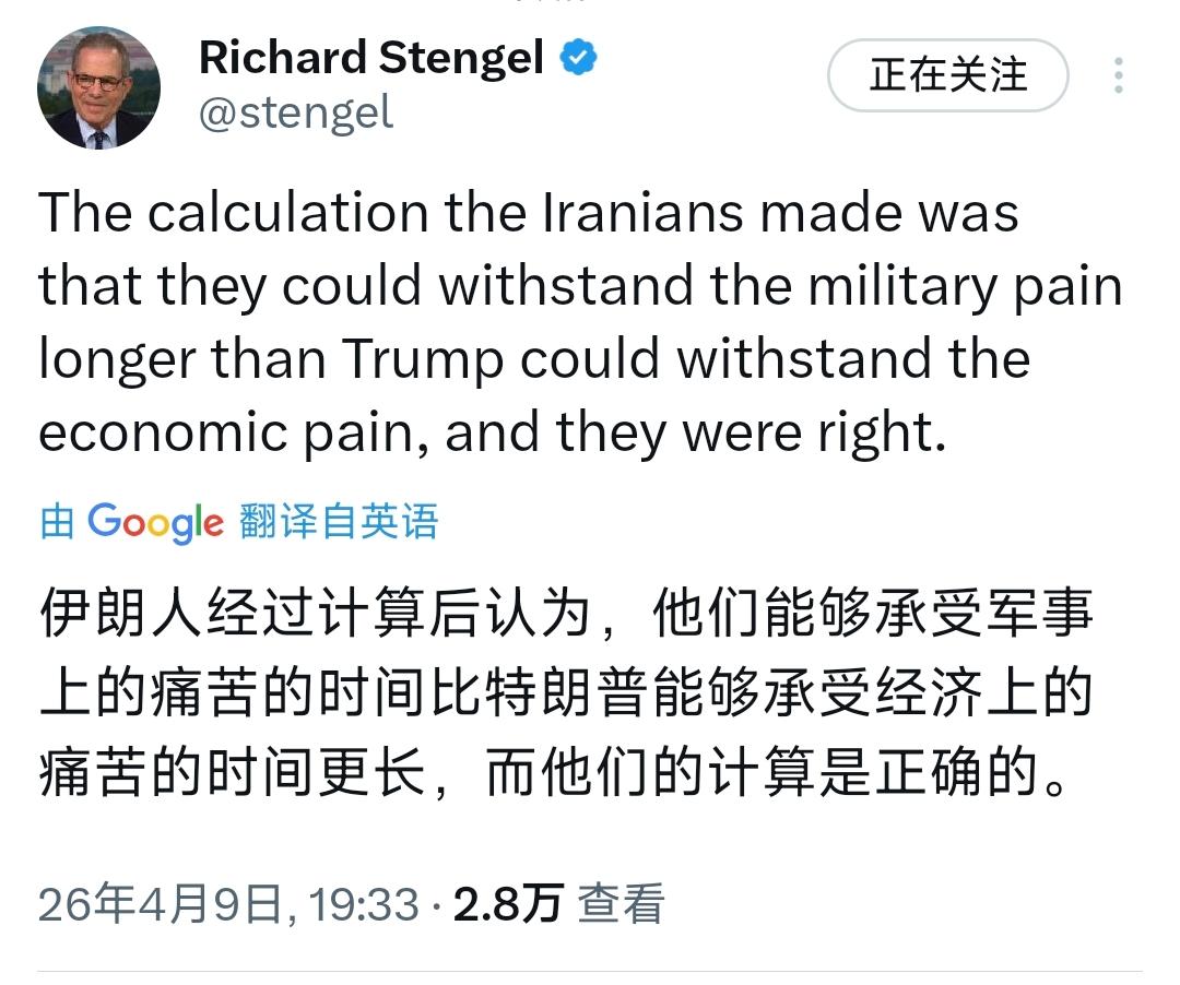 美国前副国务卿理查德·斯坦格尔今晚(北京时间4月9日晚)写道:“伊朗人经过计算后认为,他们能够承受军事上的痛苦的时间比特朗普能够承受经济上的痛苦的时间更长,而他们的计算是正确的。”