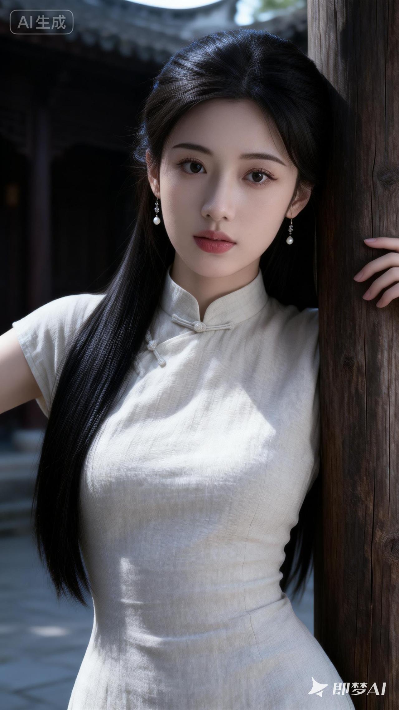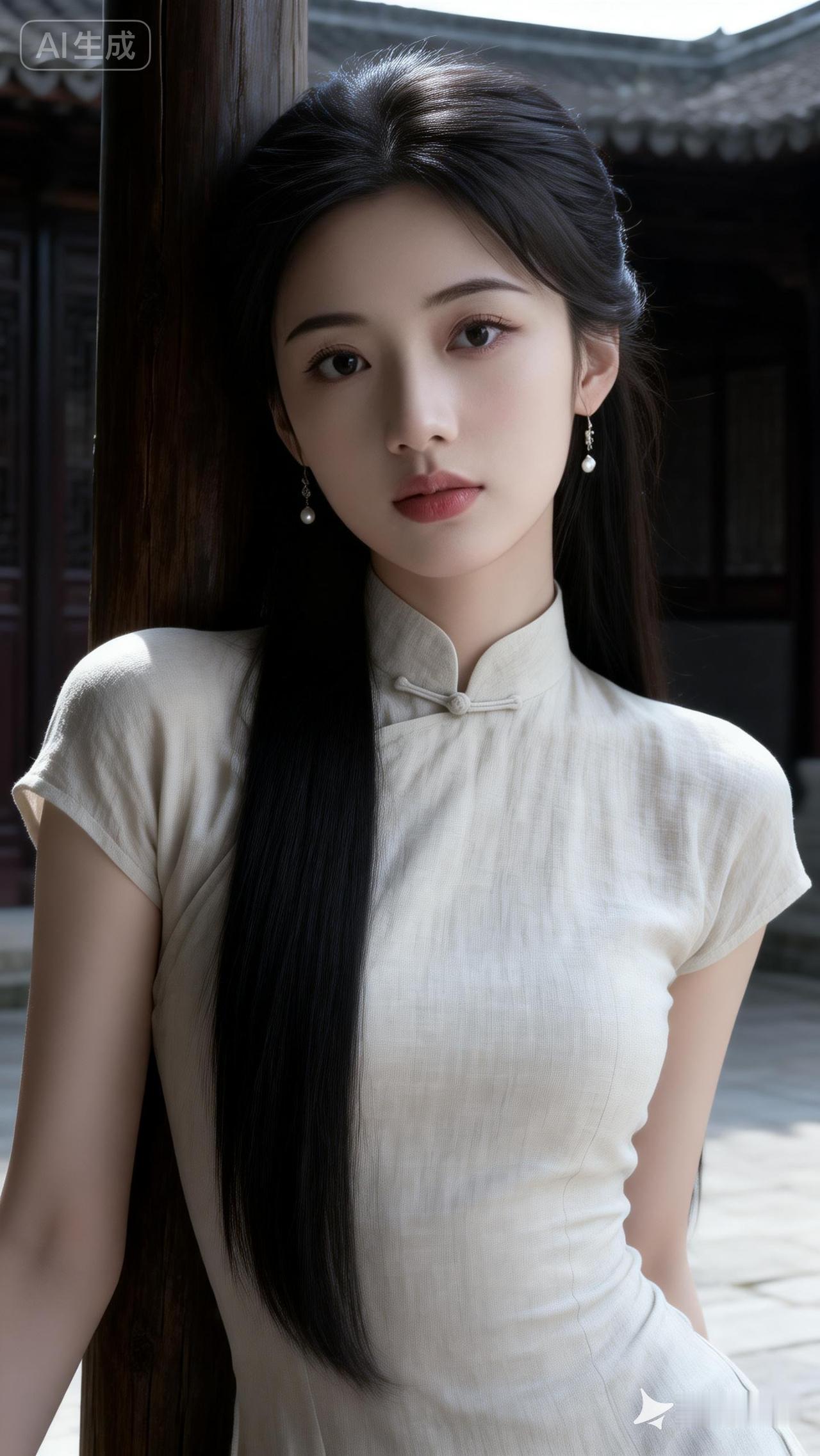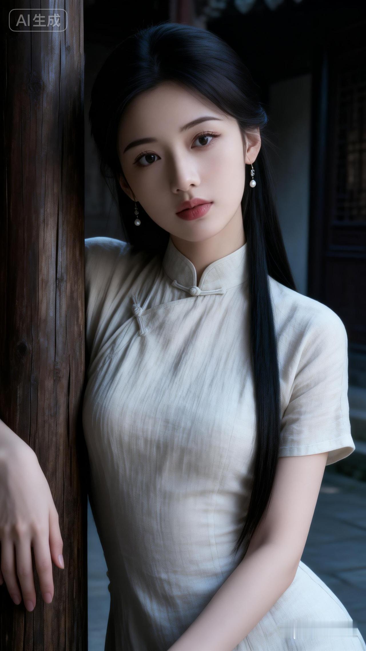 优雅旗袍少女,倚墙而坐,尽显东方韵味。