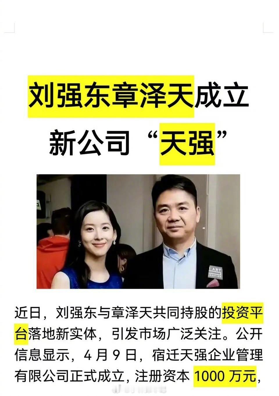 【刘强东和章泽天新公司叫天强】刘强东章泽天新公司取名“天强”,一人一个字,甜是真甜,商业布局也是真稳。