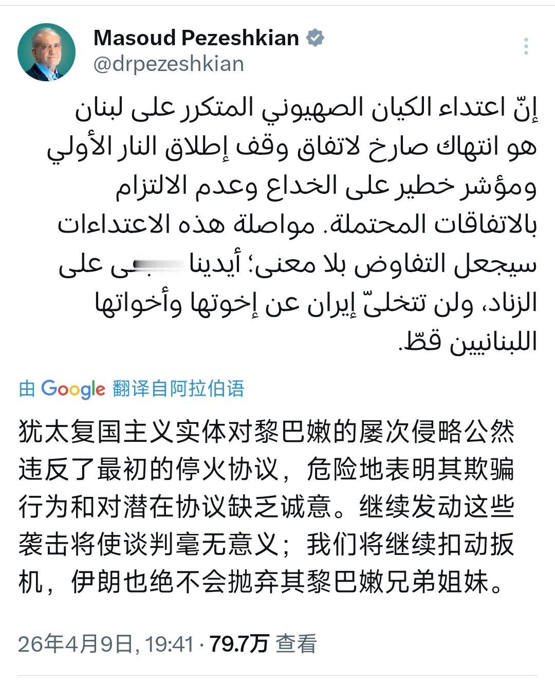 伊朗总统佩泽希齐扬今晚(北京时间4月9日晚)写道:“犹太复国主义实体对黎巴嫩的屡