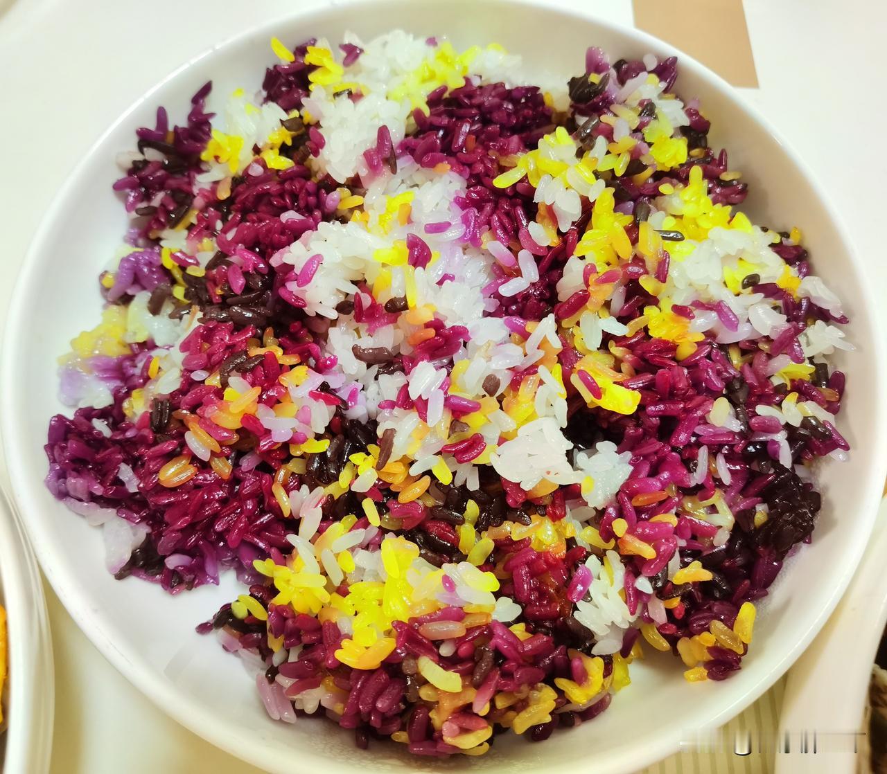这饭颜值确实高,黑、红、黄、白、紫五种色彩,红色今天没做,只有四个颜色,五颜六色的,看着就很有食欲。
