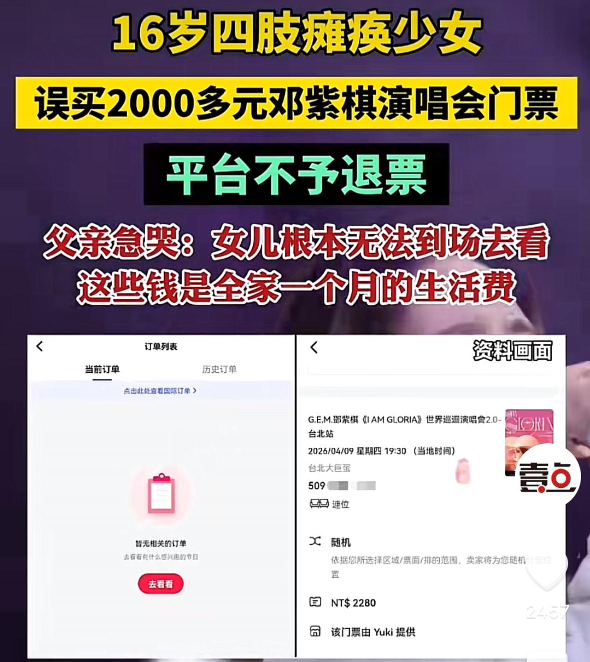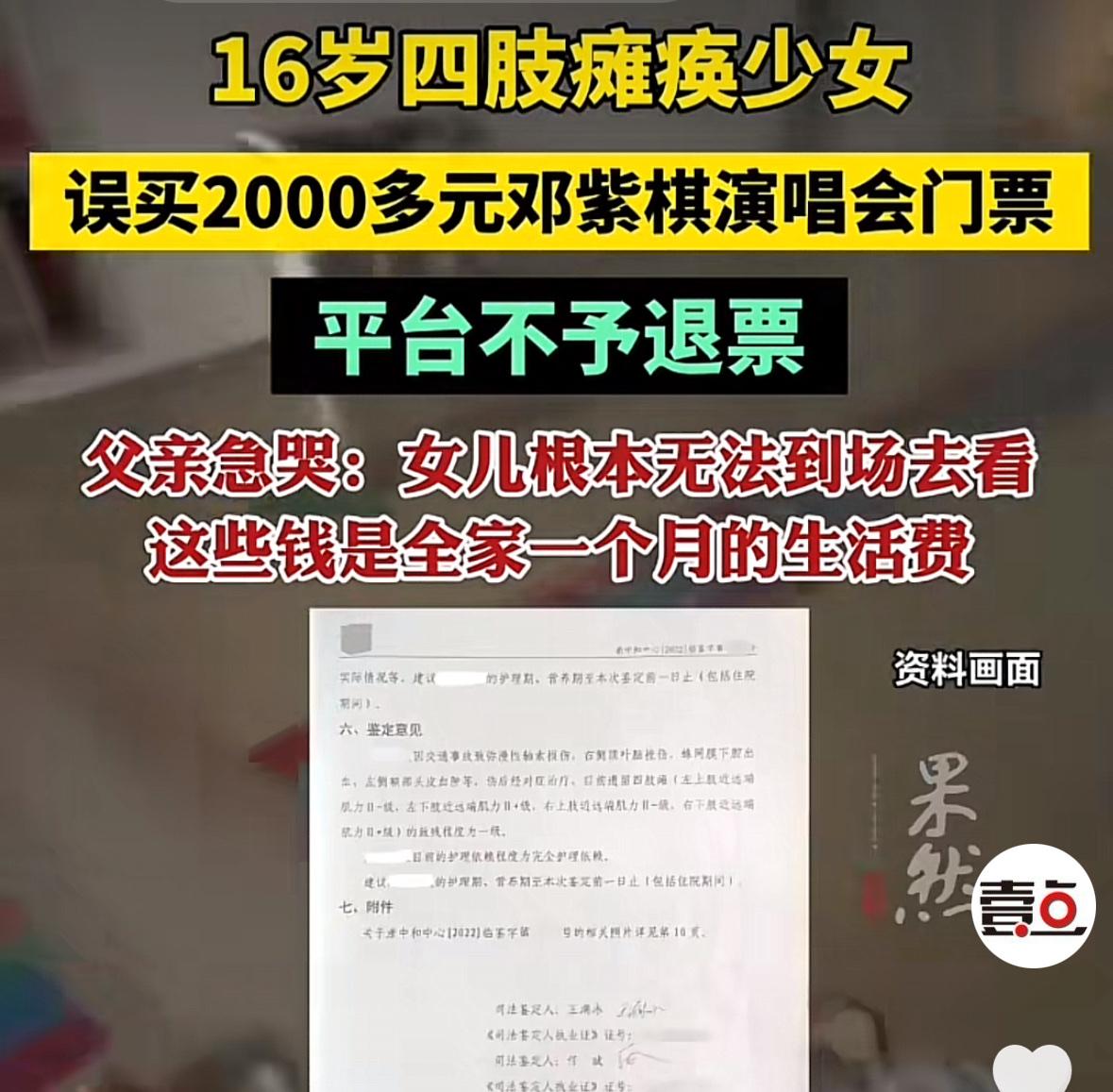急哭了!16岁女孩,患有精神疾病和肢体残疾,因手误,在网上购买了一张2000多块的某歌星演唱会门票。父亲得知后,赶紧联系平台,称女儿是手误,且女儿的身体状况根本无法前往观看,希望平台退款。可平台却说,已售出门票,概不退款,除非让法院出具女儿是无民事行为能力人的证明。父亲都快急哭了,这几年家里为了给女儿治病,已经倾家荡产,妻子也因病丧失了劳动能力,一家人就靠他一个人跑滴滴挣钱,这2000多块,可是他们一家一个月的生活费!