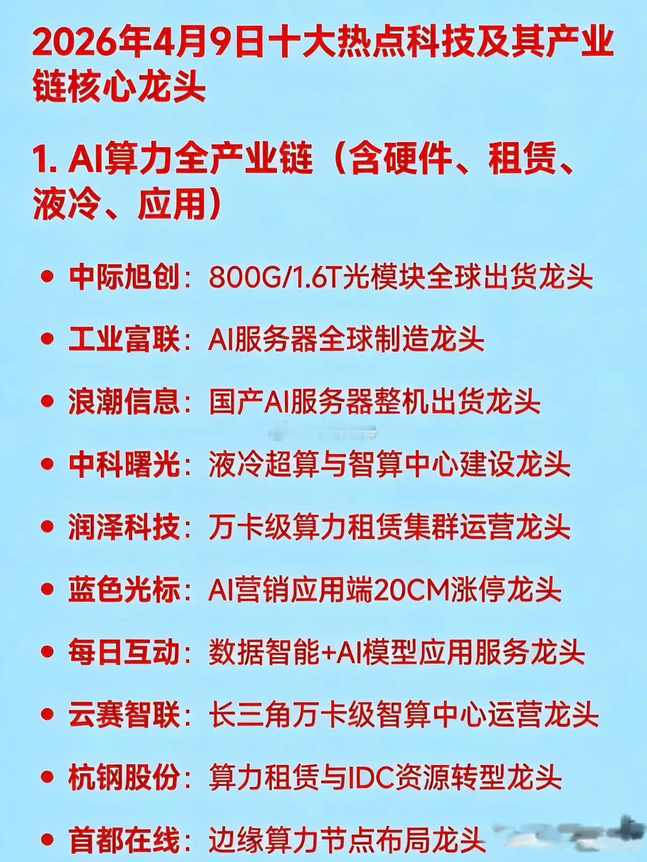 2026年4月9日十大热点科技及其产业链核心龙头1. AI算力全产业链(含硬件、