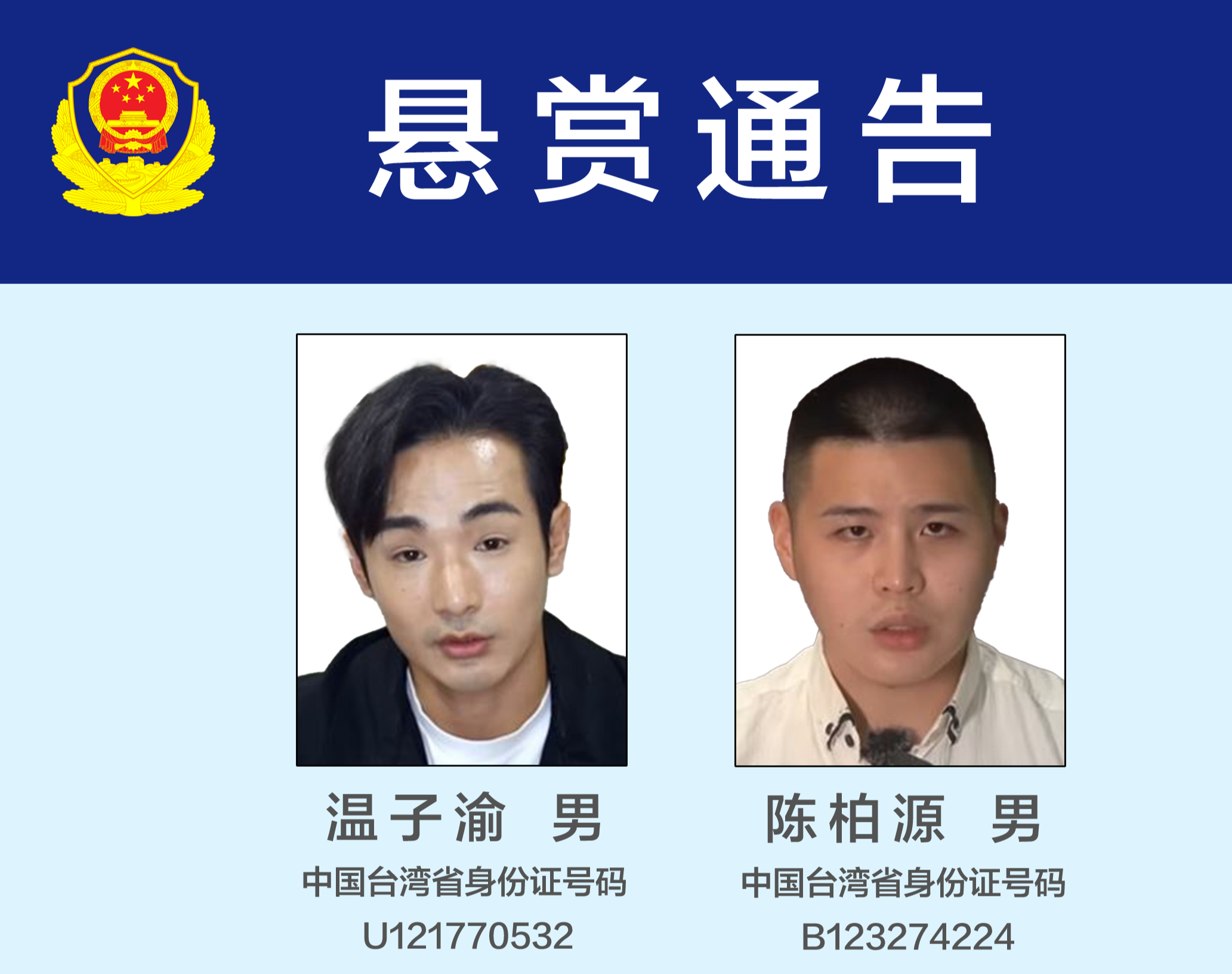 2025年11月13日,福建省泉州市公安局发布悬赏通告,针对台湾网红温子渝(网名"八炯")、陈柏源(网名"闽南狼")涉嫌违法犯罪行为,公开征集线索。