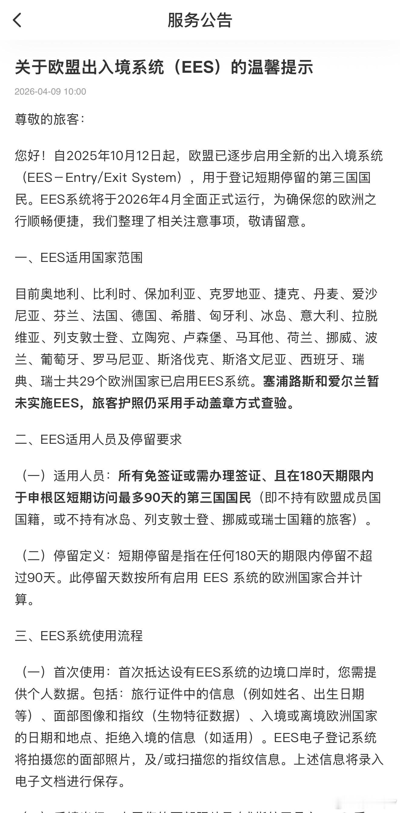 欧盟EES系统将于2026年4月全面正式运行