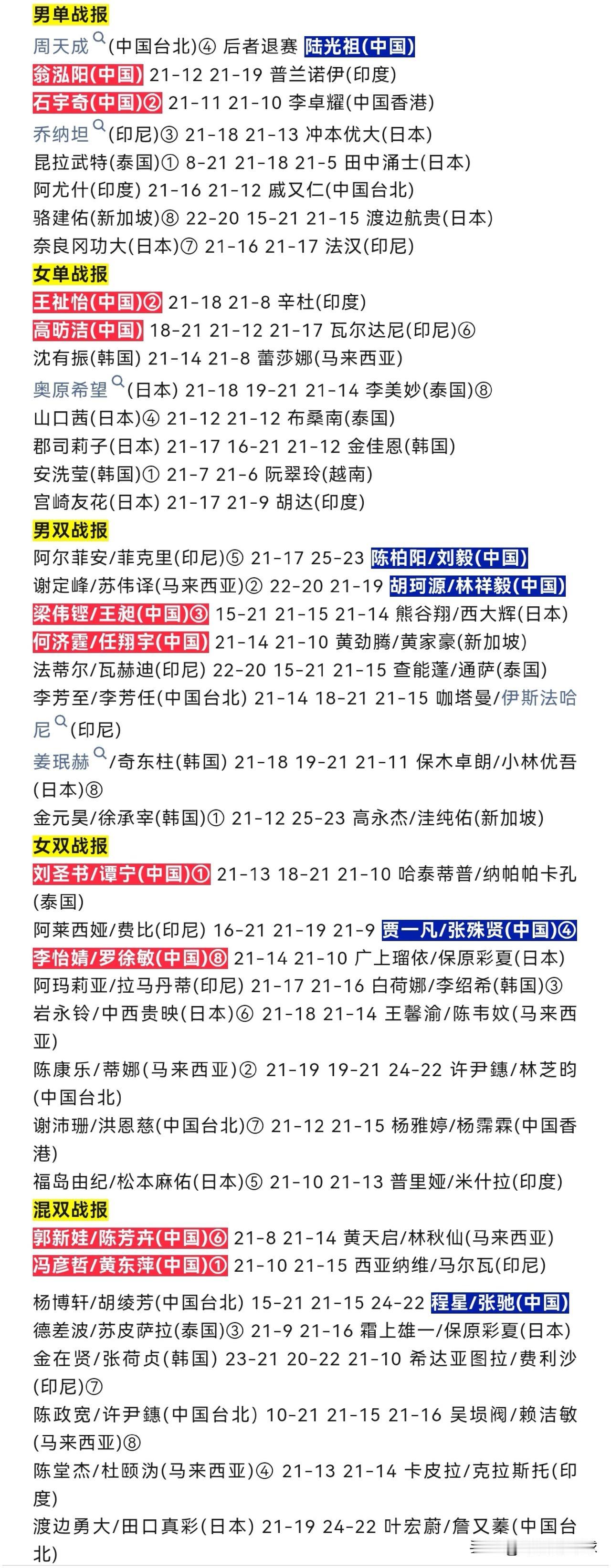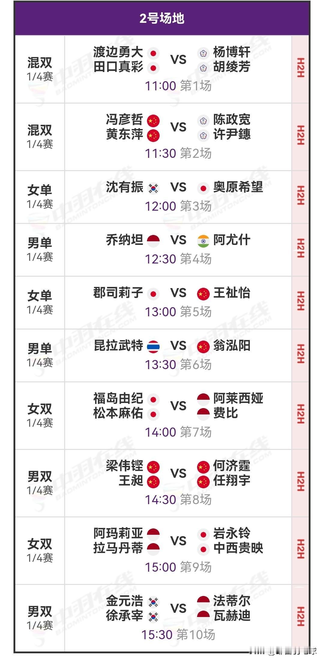 今日北京时间11:00起,1/4决赛正式开战,共有两块场地同时进行比赛。今日对阵分别为石宇奇对战奈良冈功大,翁泓阳对阵昆拉武特,高昉洁对阵山口茜,梁王组合与任何组合展开内战。今日详细对阵安排和昨日详细战报如图所示。