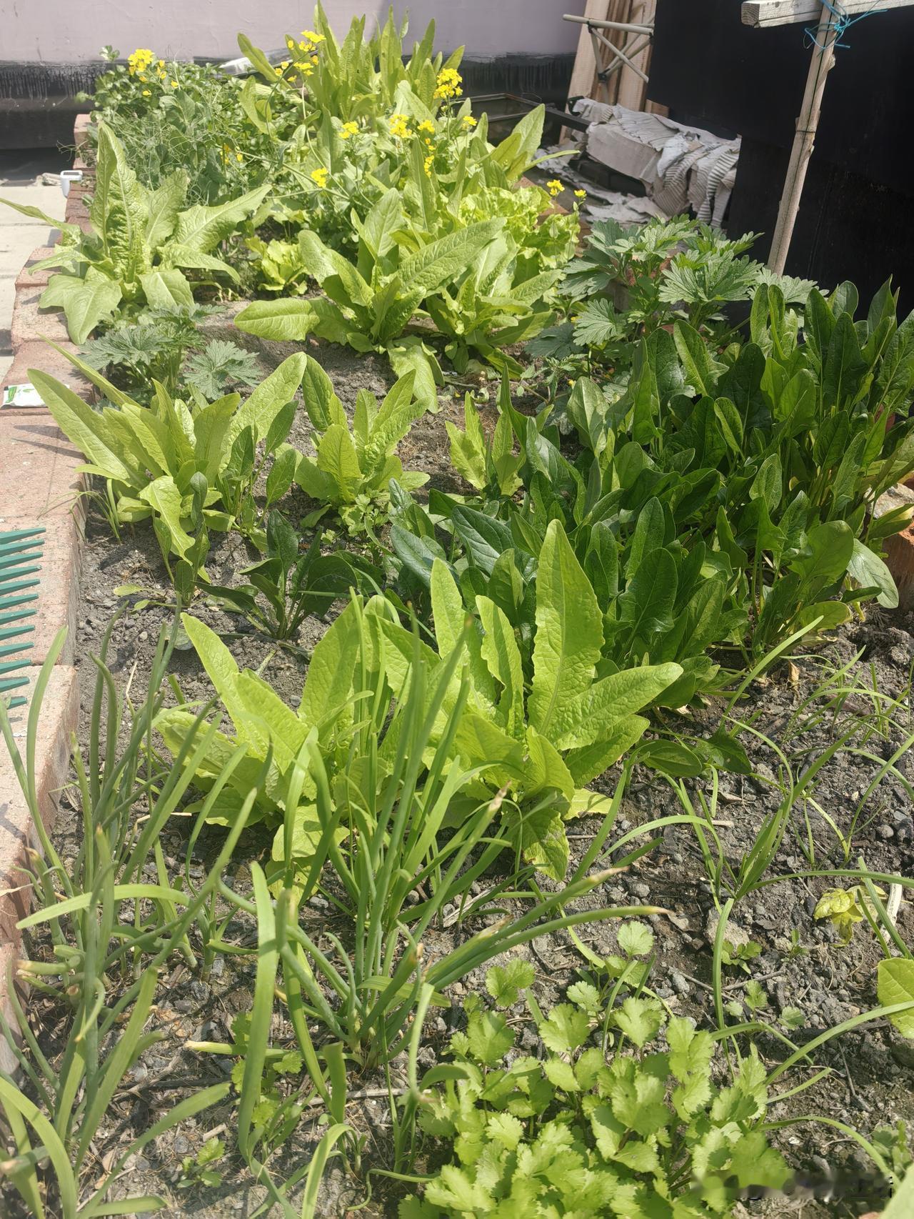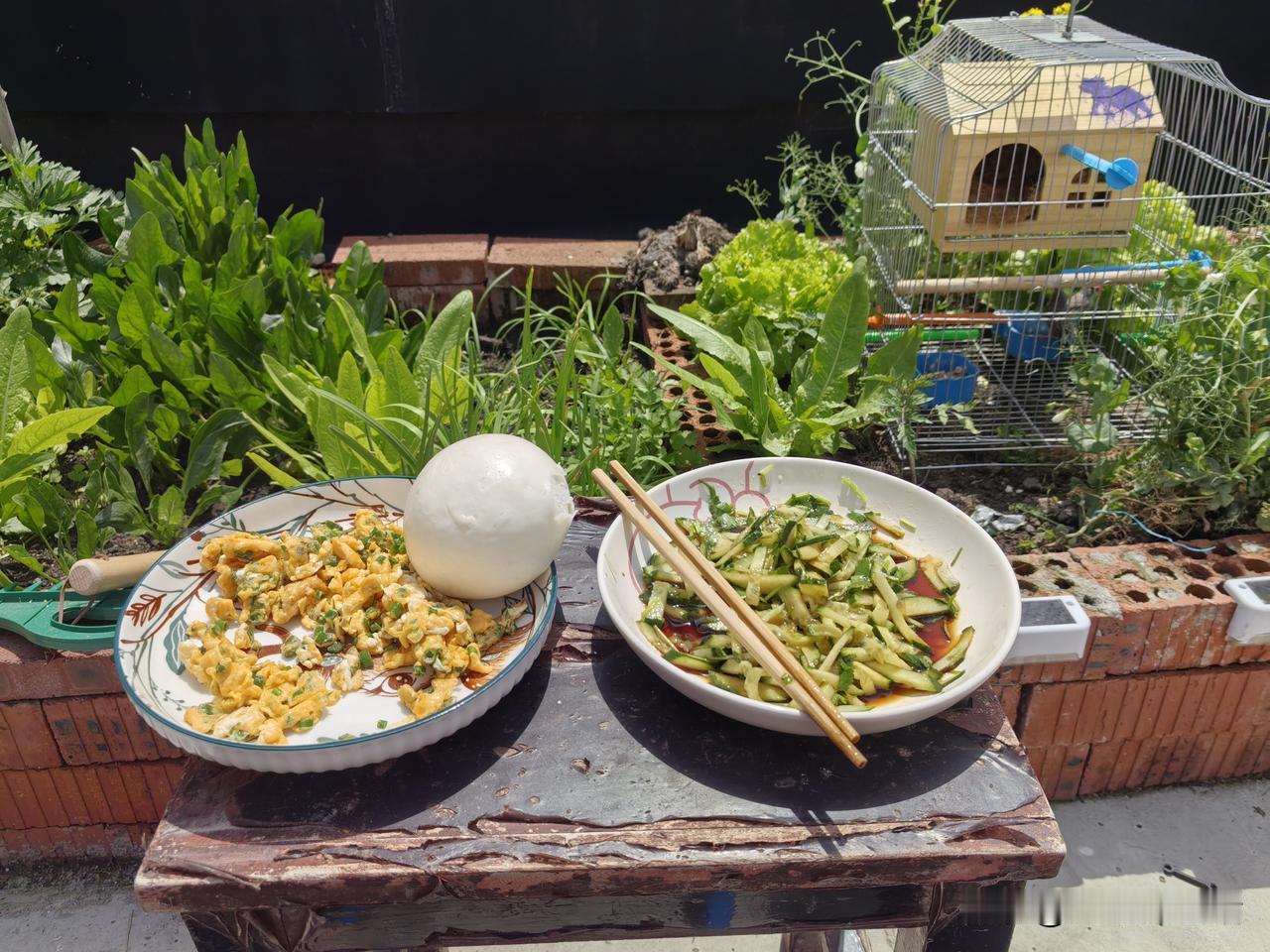 来欣赏一下我的楼台一角,种了点青菜,养了一对珍珠鸟,泡了一杯绿茶。