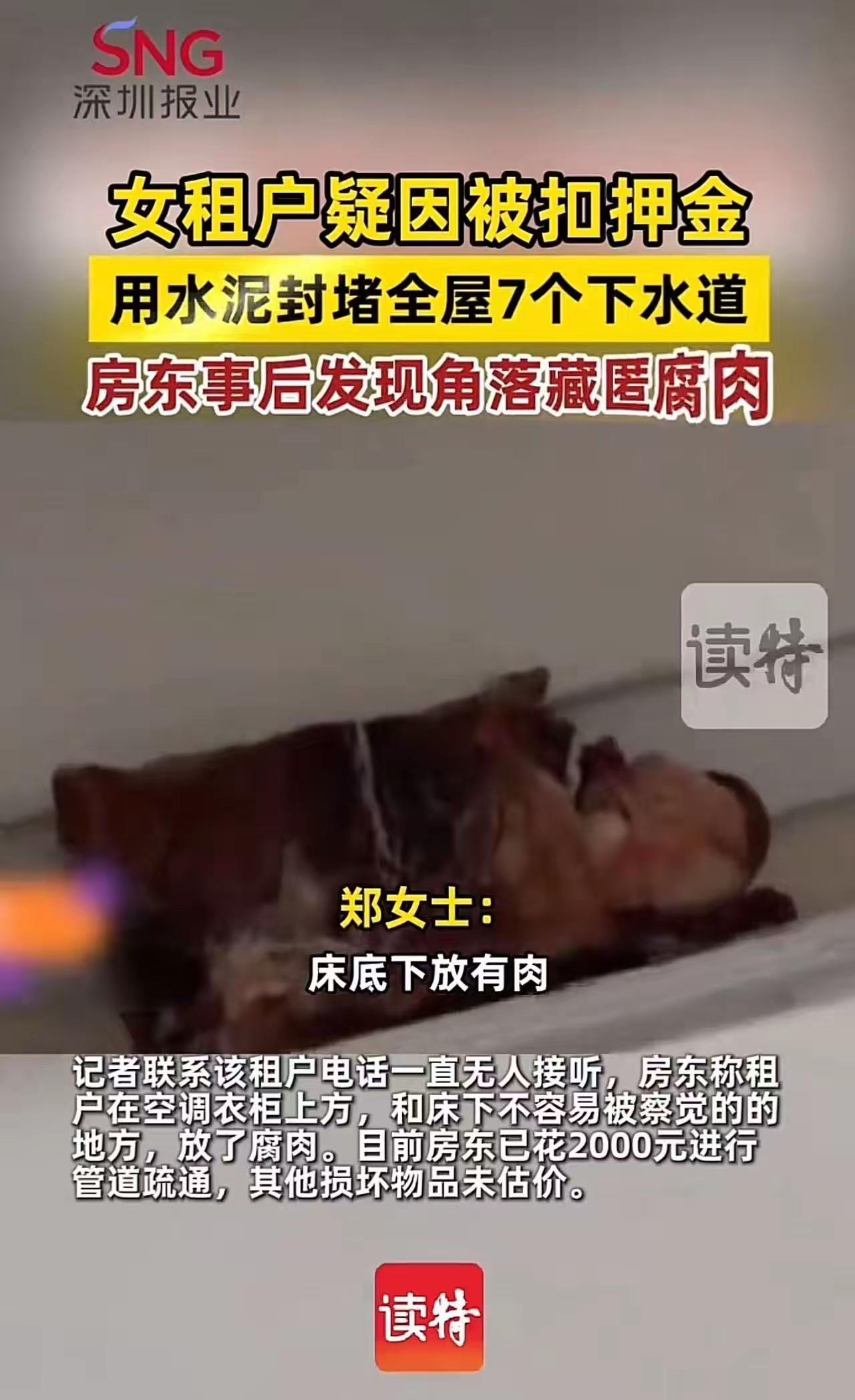 女租客因为被房东扣押金,用水泥封堵全屋7个下水道,还在房间隐秘角落放腐肉,让房间臭气熏天!房东:“一个女孩子这么缺德,太没有素质了!”网友:“我也是房东,说实话,租户走咱们应该给租客退押金,不能耍赖!”
