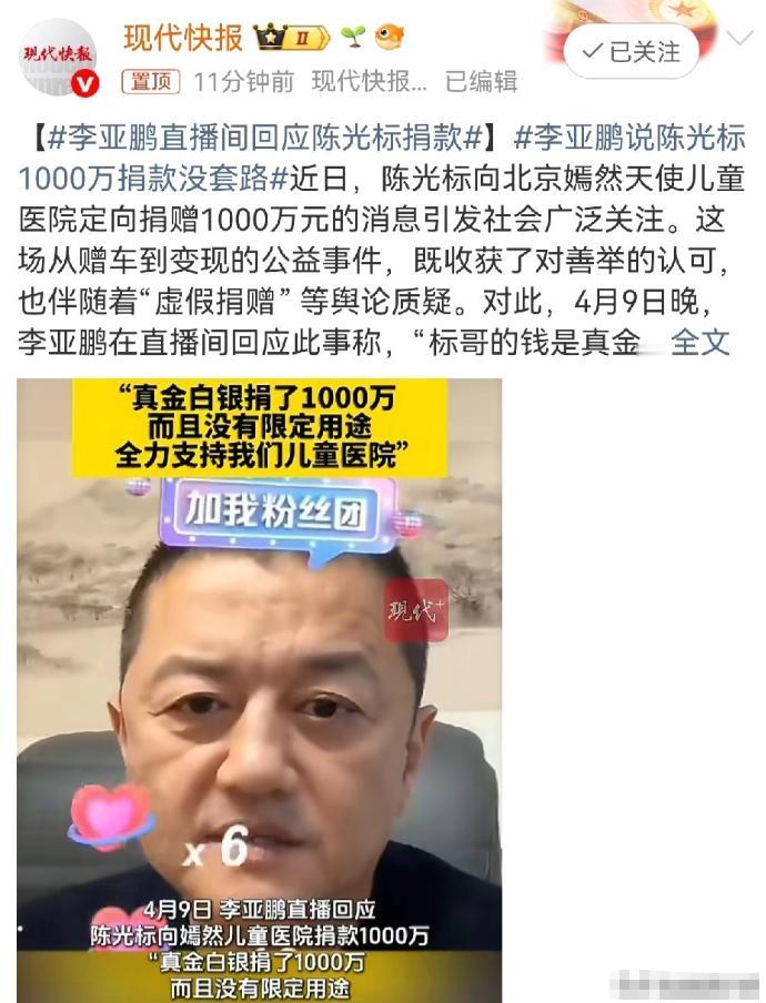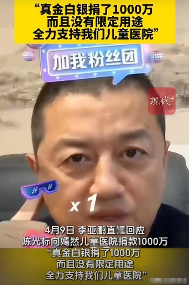 4月9日晚上,李亚鹏连夜冲上了热搜,这次他在直播间完全不掩饰了,对网友质疑的“虚假捐赠”进行了正面回应,力挺陈光标捐款,这到底是怎么回事呢?