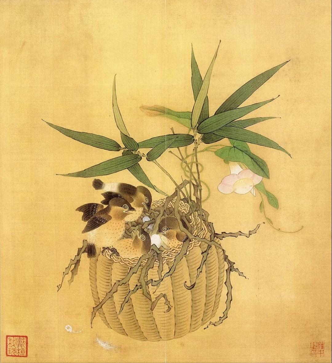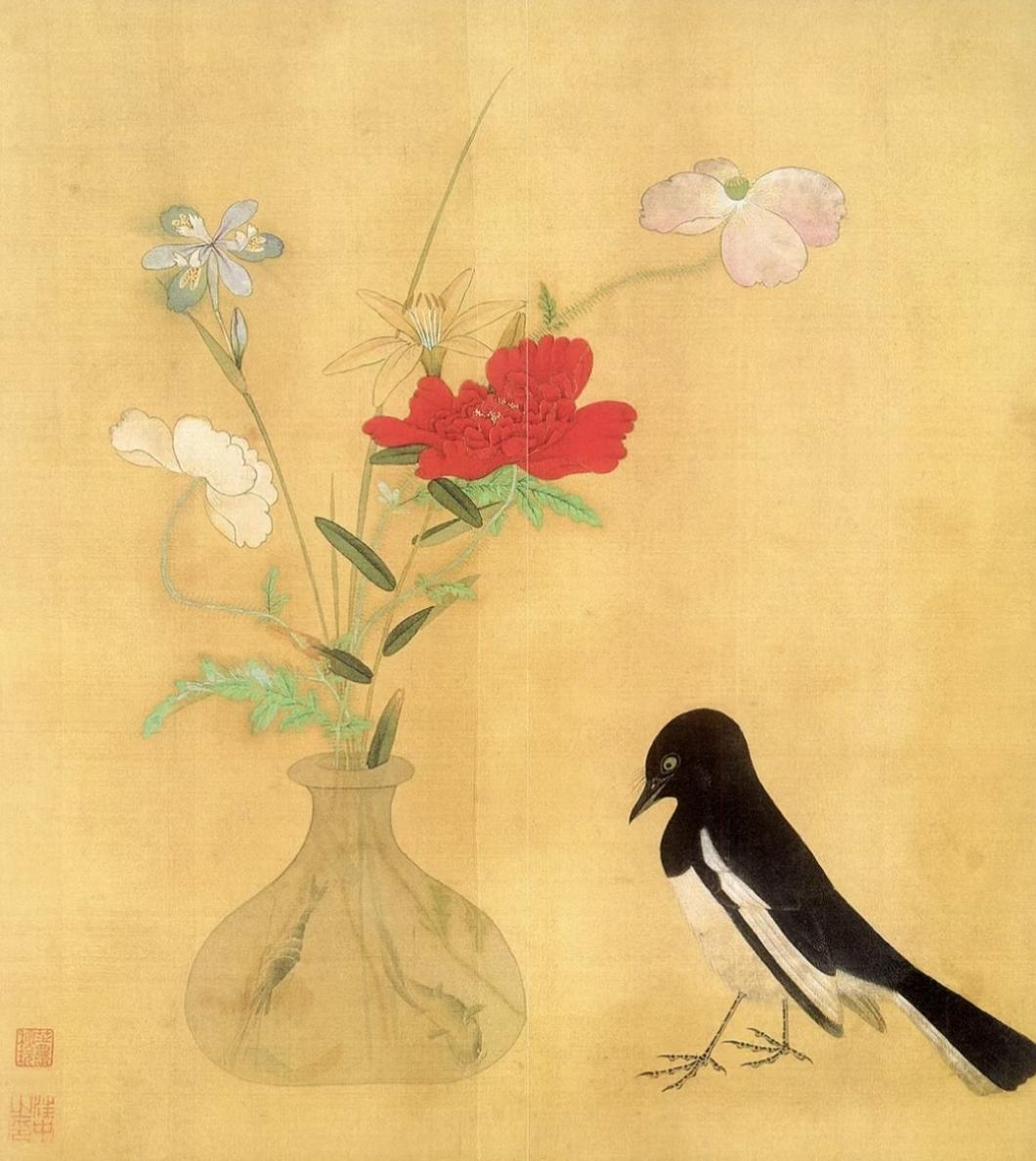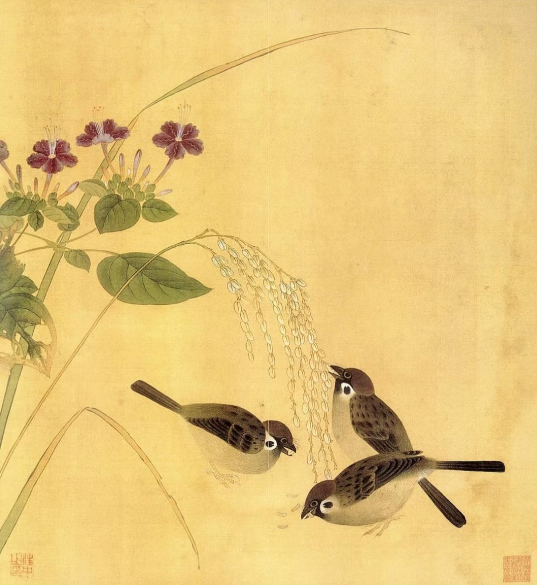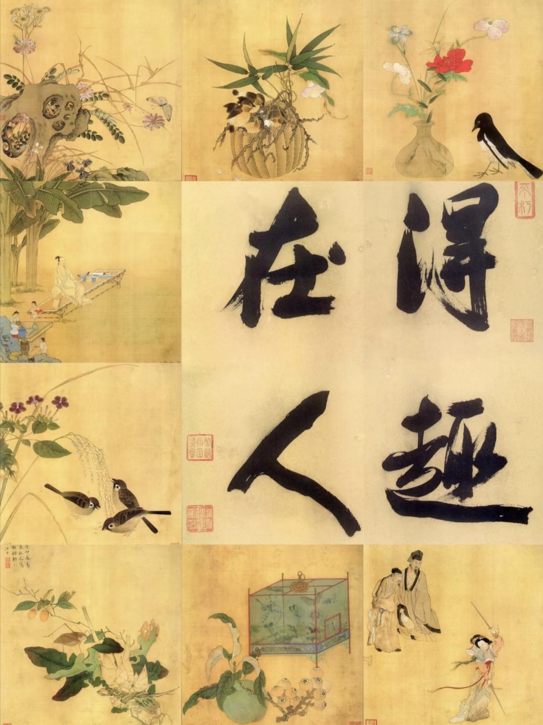 全册题材多元,花鸟、人物、山水兼具,每开皆为汪中精擅之景,工细笔触中藏文人风骨。以工笔为主,勾线精准,无一笔懈怠,翎毛、花卉、人物的细节刻画入微,如雀鸟羽毛的层次、侍女衣纹的褶皱、山石的纹理,皆栩栩如生。