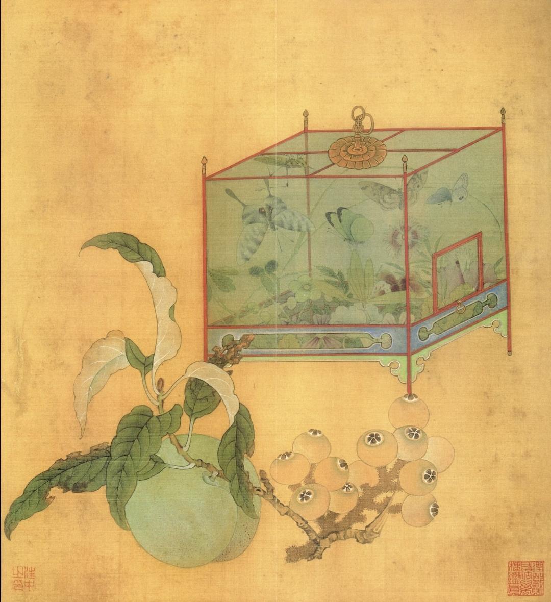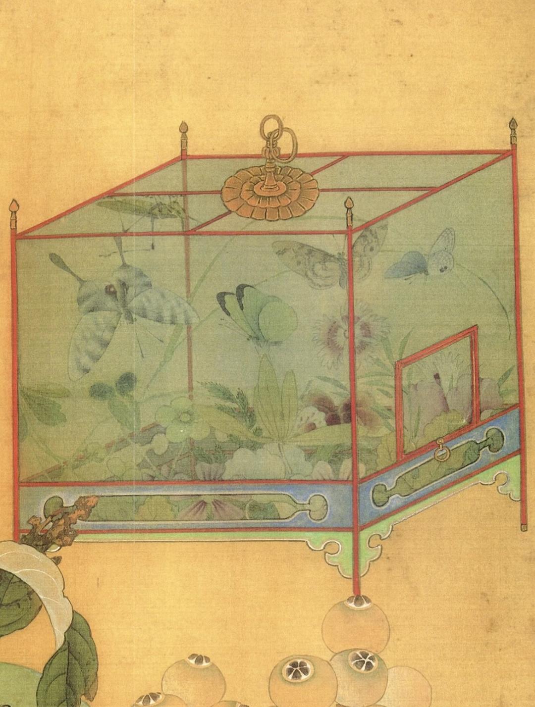 首图中精致碧纱盒内百花盛开,蝴蝶翩跹,盒前一枝枇杷叶下搭着枇杷与青桃。盒中花蝶种类丰富,灰蝶、斑缘豆粉蝶、长尾凤蝶栩栩如生。绘画 国画