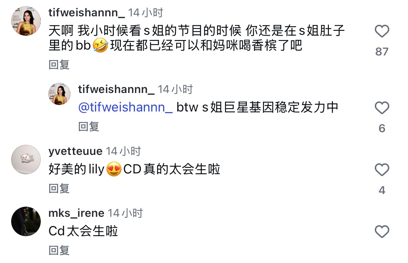 “我小时候看s姐的节目的时候 你还是在s姐肚子里的bb🤣现在都已经可以和妈咪喝香槟了吧”