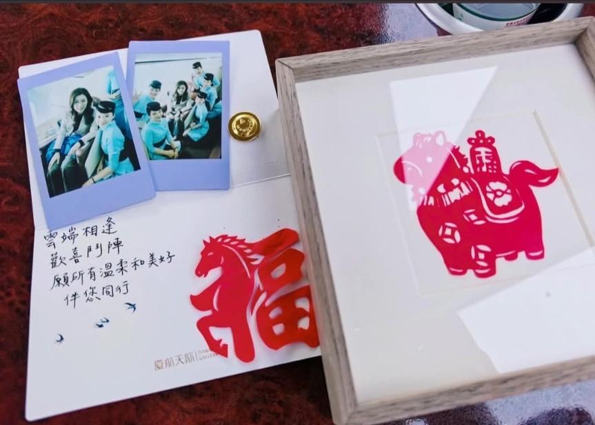 随后,郑丽文与五位美丽又专业的空服员合影留念。她还特意为她们签名留念,而空服员们也为郑丽文准备了一份贴心的礼物——一张手写的祝福小卡片,以及一幅精美的"马上有福"剪纸。