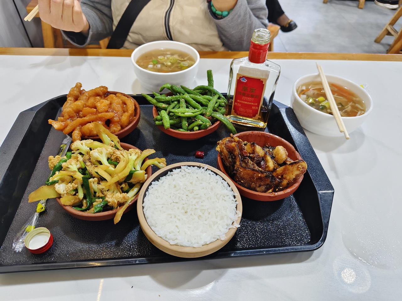 最后,选择了一家小碗菜店,这是我们喜欢的就餐方式。这家店很火。我总结的原因是:这家的服务男生都是帅小伙,语言温柔,操作娴熟,服务周到。特别是他们给我们推荐的四道菜太适合我们了。再就是这家的菜品一格一味,毫不违和,属于很中吃的那种。来这里的大都是老顾客,堂食的,打包的,还有那出来进去的外卖小哥,都在证明这家店饭菜的质量。最后是这家菜品真的是超实惠,如图所示吃饱喝得只要23元钱。