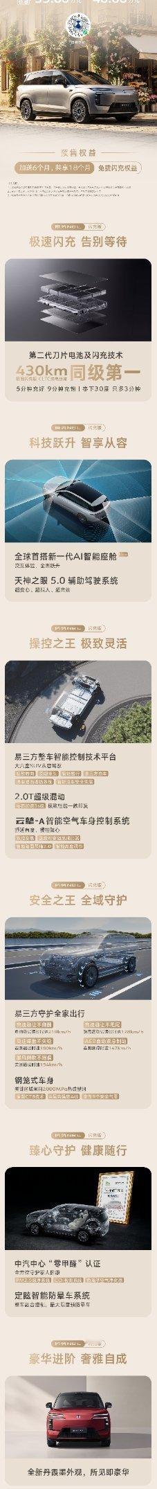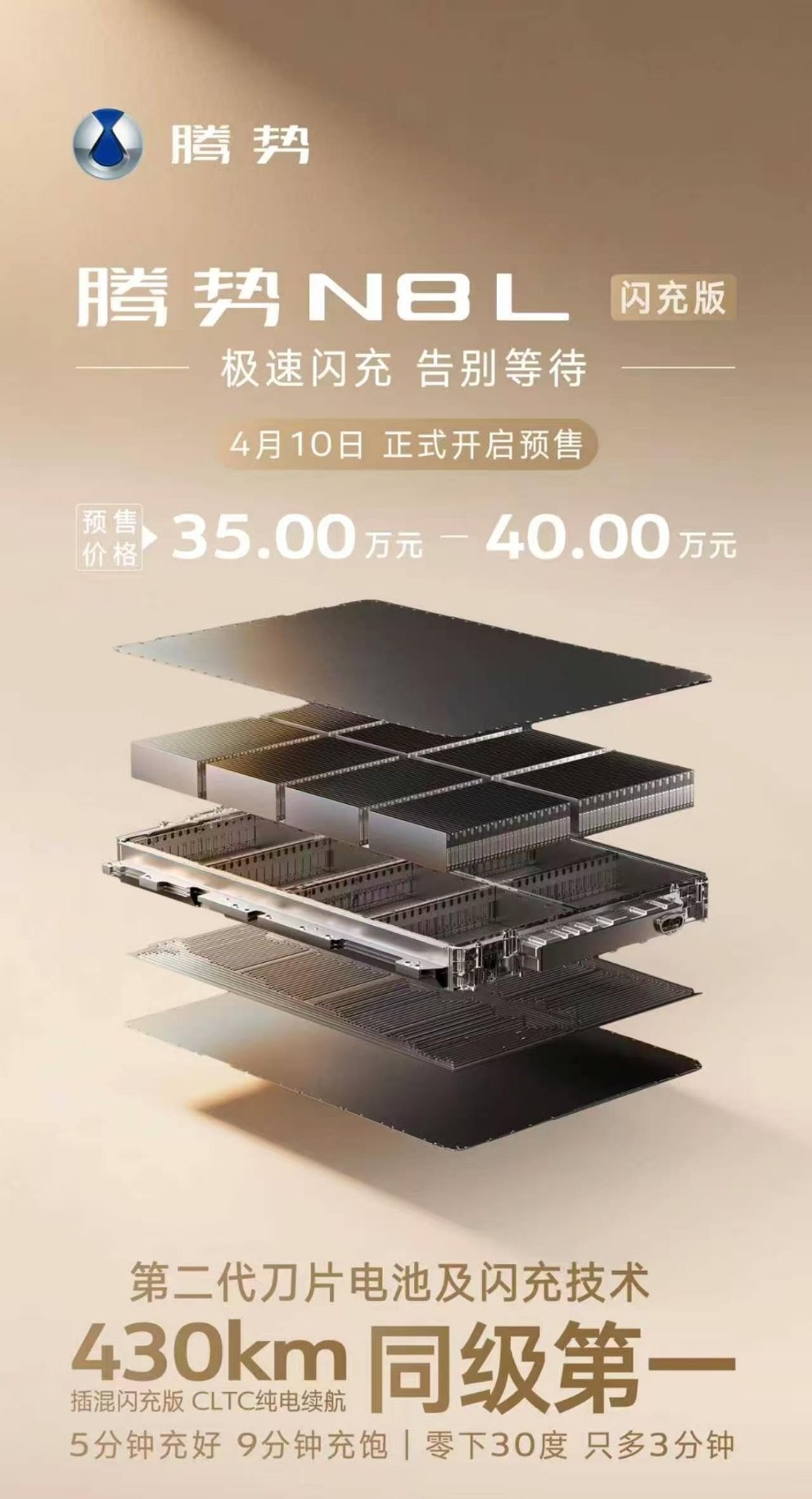 腾势N8L 闪充版来了,第二代刀片电池及闪充技术全面上车,而且最关键的是,插混闪充版纯电续航去到了430km。