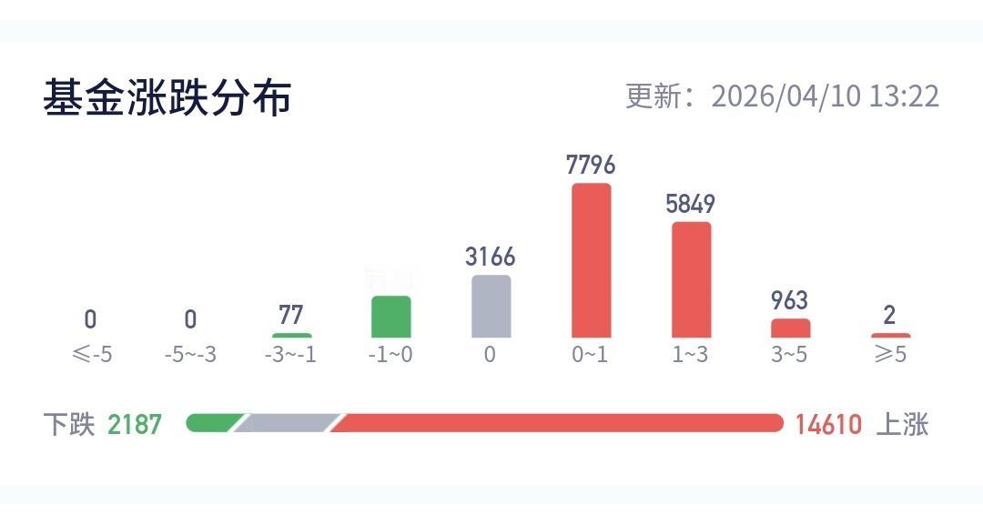 整个基金市场,上涨14610家,下跌2187家,上涨幅度超过5%的2家,没有下跌幅度超过5%的基金。
