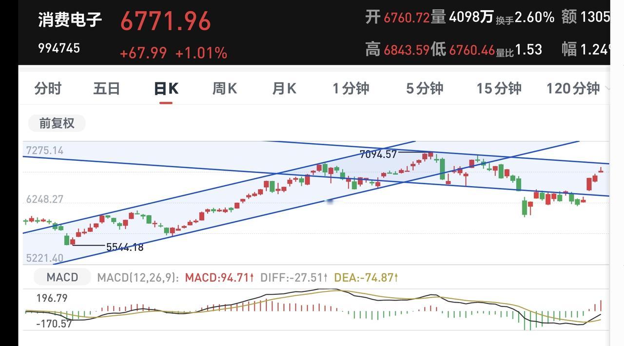 消费电子板块周线级别处于上涨通道中,今天的上涨并没有改变周线级别的上涨趋势,长线持有的人可以继续持有。