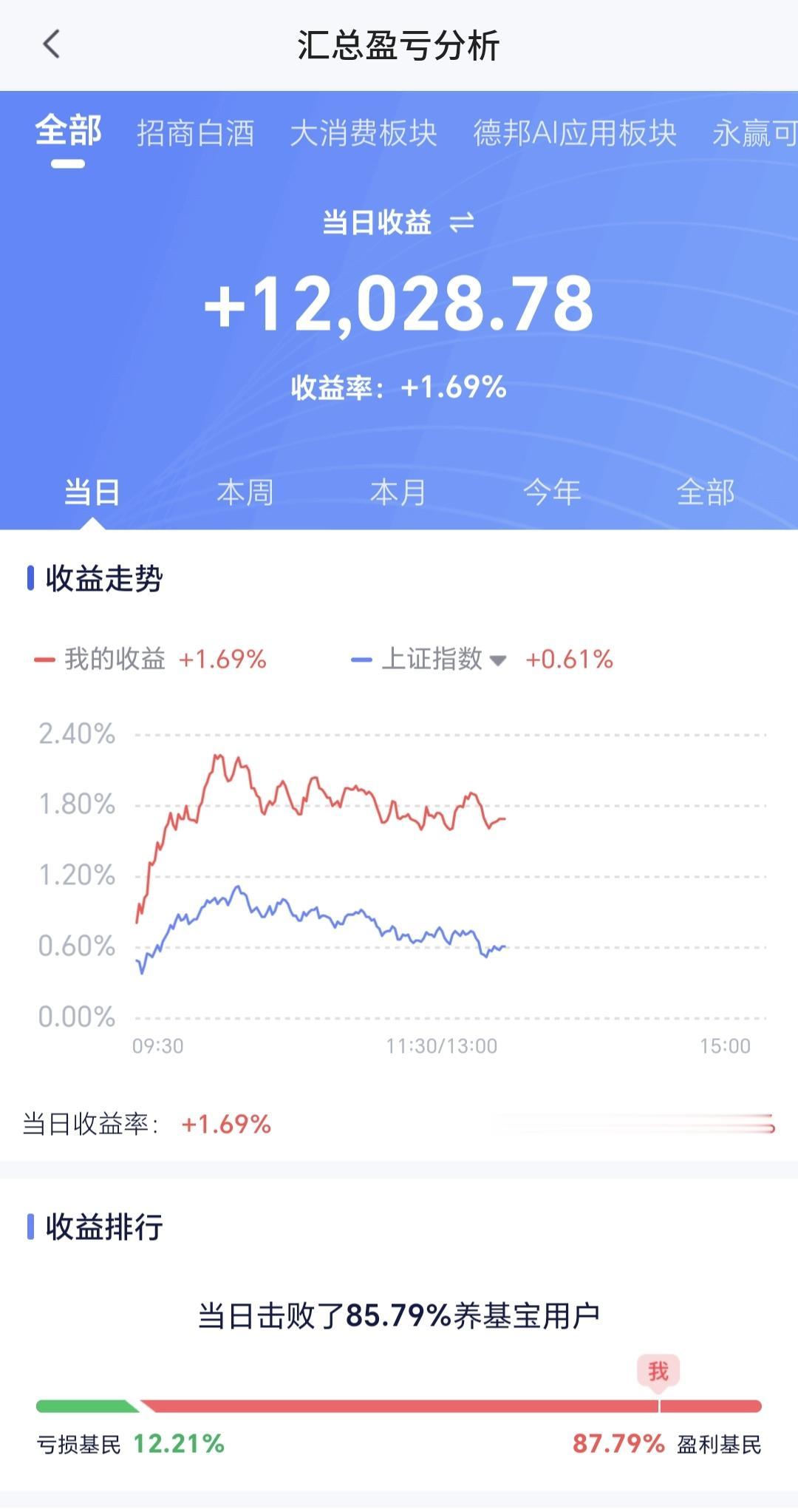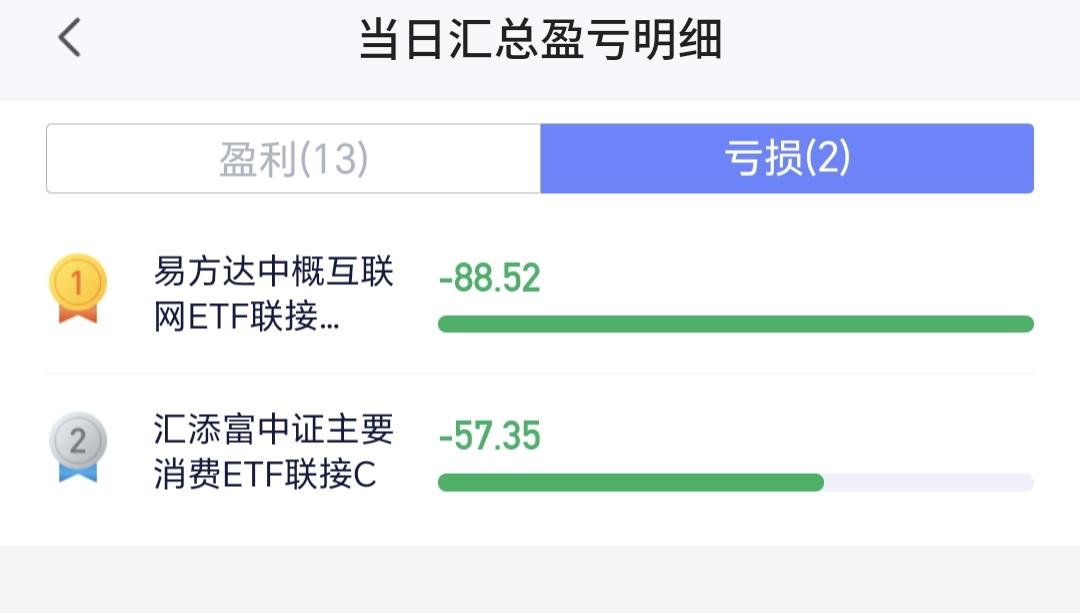 持有的基金中,盘中估值盈利金额最大的三个板块是:证券板块,创业板指,5G板块,估值亏损的只有海外互联网板块和大消费板块,估值整体上涨了12028元。
