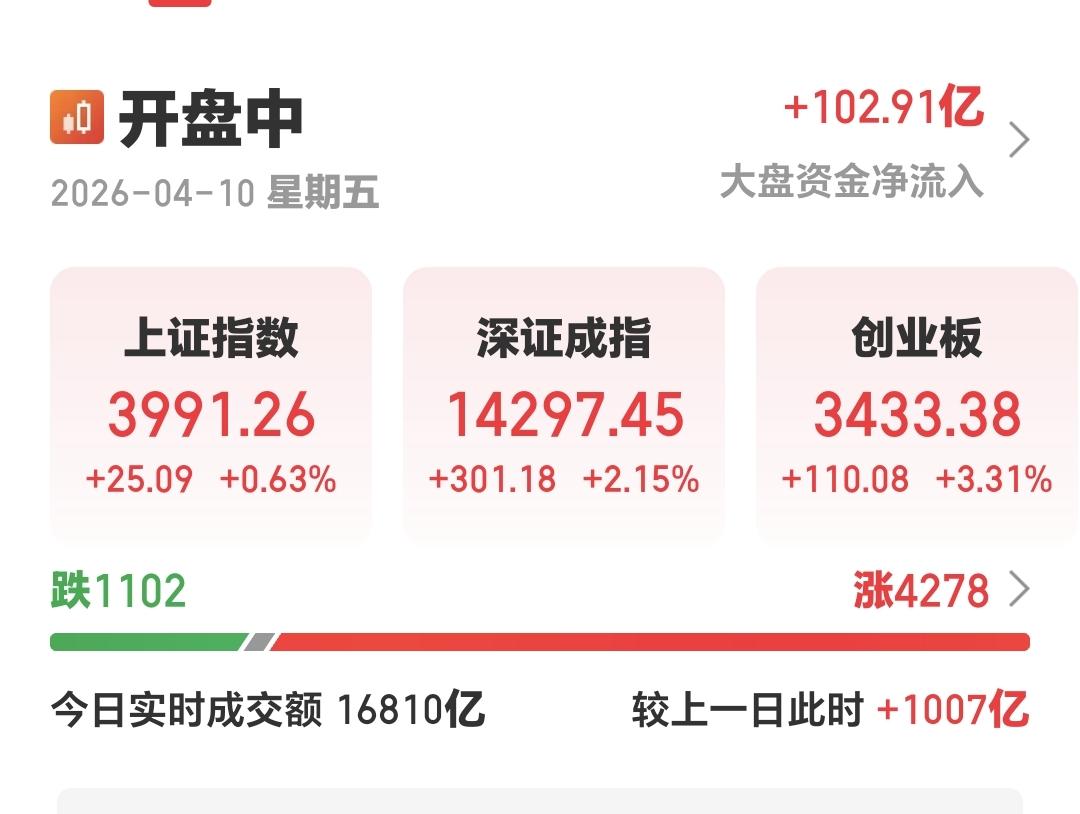 整个股票市场,上涨4278家,下跌1102家,两市累计成交16810亿,相比于上一个交易日同期放量了1007亿,主力资金净流入102亿。