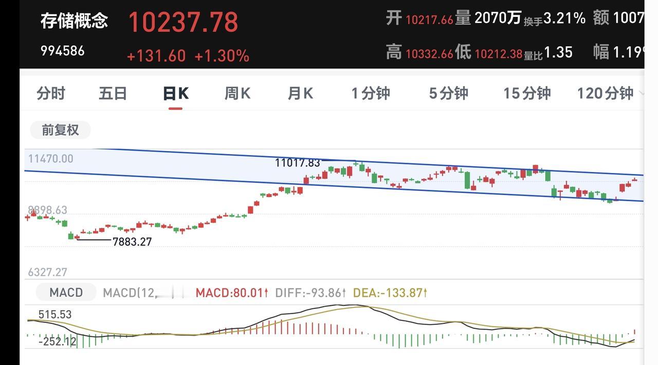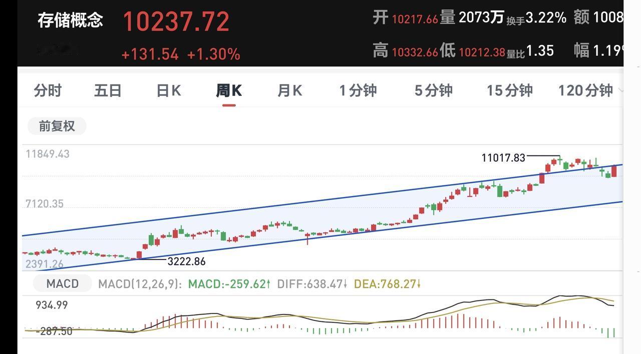 存储概念板块周线级别处于上涨通道中,今天的上涨来到了这个上涨通道上轨线附近,持有的人可以继续持有,不建议在这样的位置追涨进场。