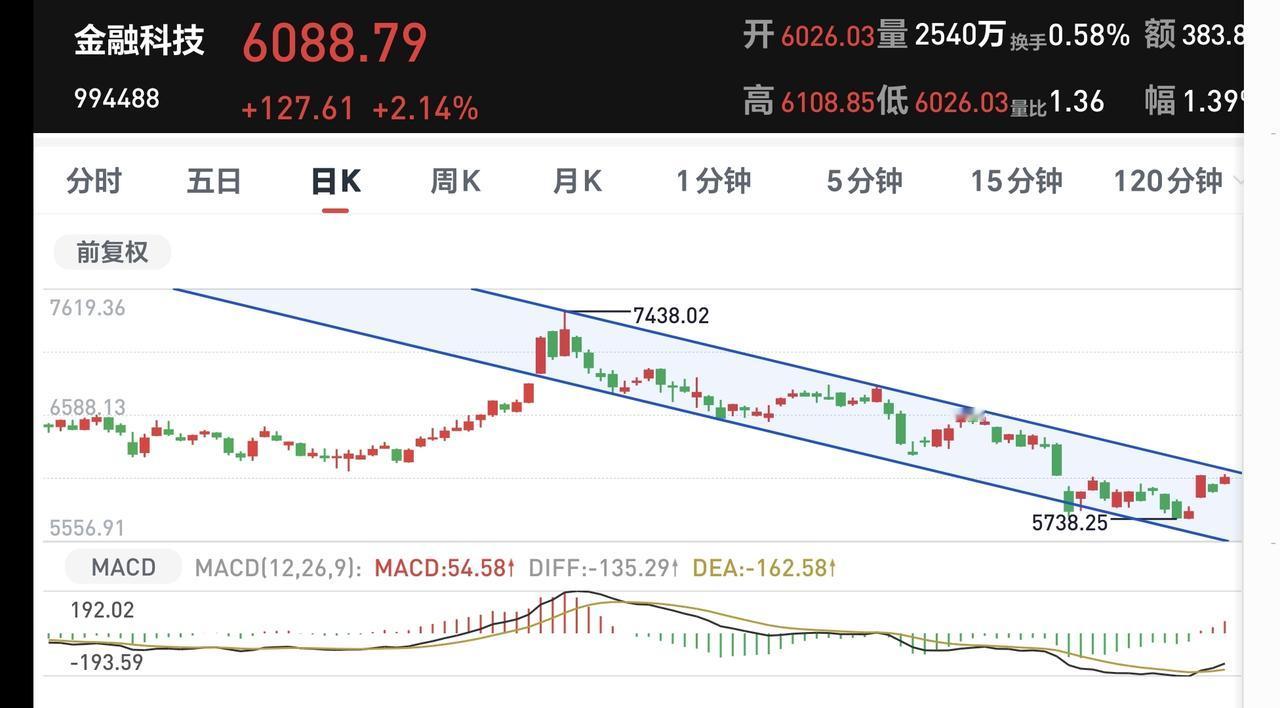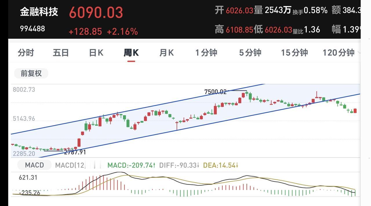 金融科技板块周线级别处于上涨趋势破位中,今天的上涨并没有能够改变周线级别的下跌趋势,长线持有的人继续注意风险,注意观察日线级别下跌通道的上轨线能不能被突破。