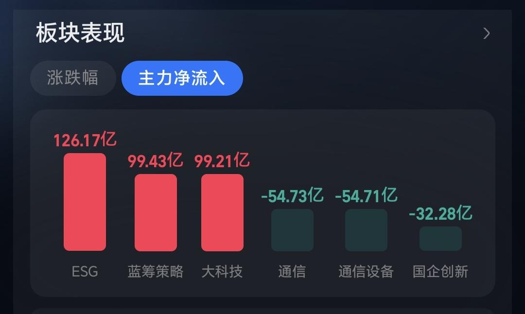 主力资金净流入最多的三个板块是:Esg板块,蓝筹策略板块,大科技板块,主力资金净流出最多的三个板块是:通信板块,通信设备板块,国企创新板块。