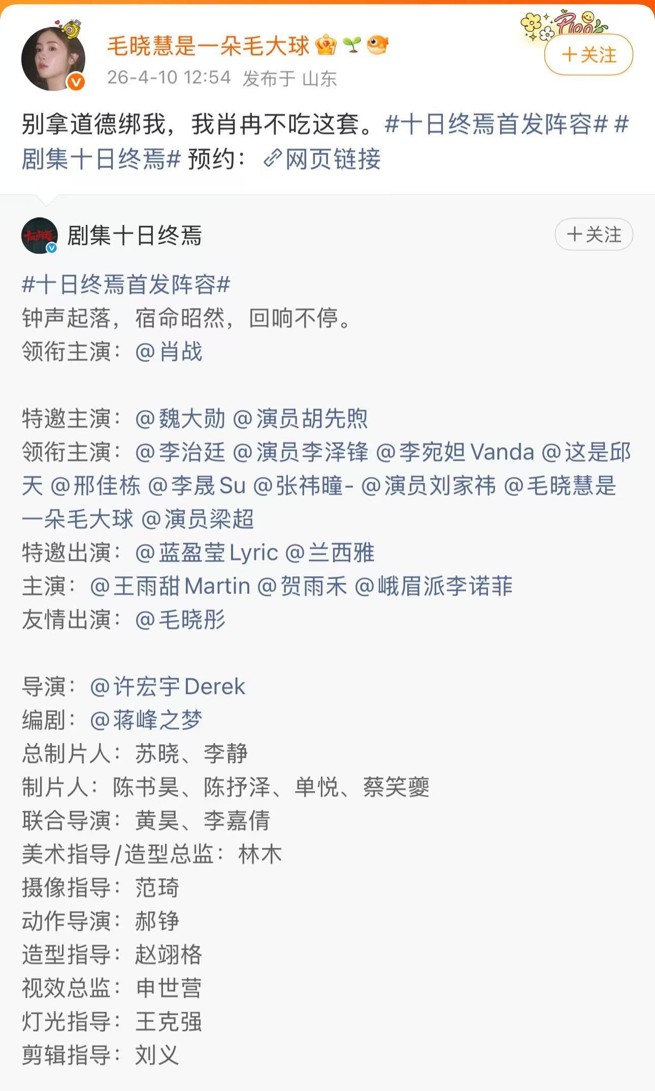 十日终焉毛晓慧演肖冉十日终焉官宣毛晓慧演肖冉 十日终焉首发阵容 首发阵容太惊艳!毛晓慧出演肖冉让人眼前一亮,形象气质高度适配,相信她能诠释好角色,满心期待新上线!