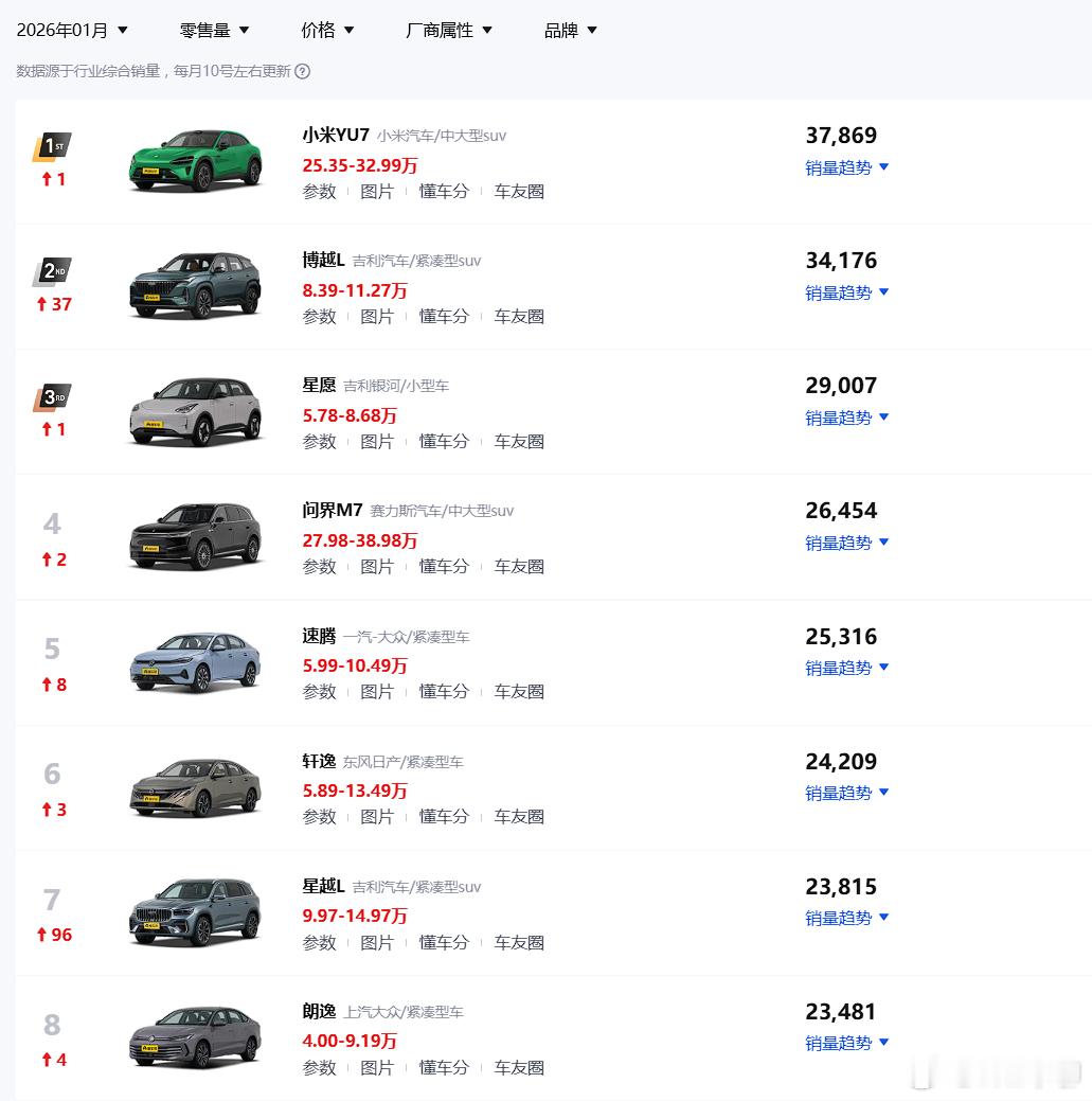 1月的小米YU7还是在榜一的(图2),现在3月了,YU7只交付了13558辆,2月过年,产线休息,YU7都交付了20196辆……