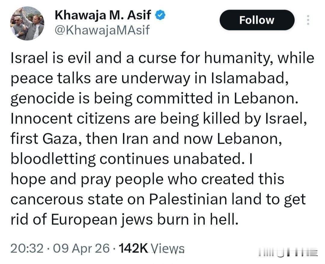巴基斯坦国防部长赫瓦贾·阿西夫公开发声,对以色列发出最严厉谴责:以色列是邪恶之辈,是人类的祸害!