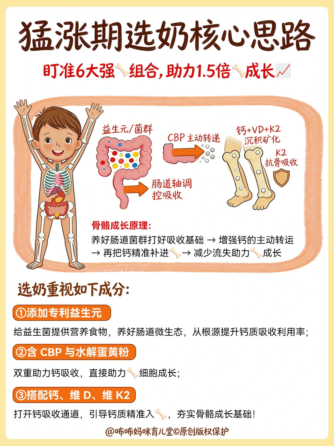 👉 硬核实力:6大组合是能作战的“特种兵”!维生素K2像导航领钙入🦴;水解蛋黄粉和CBP在里面“搞建设”;钙+维D+益生元组成黄金三角,喝进去的都朝着成长使劲!