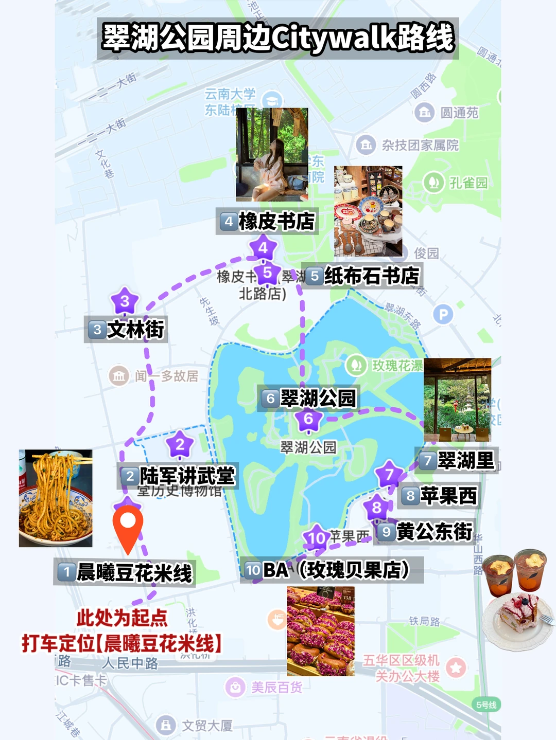 豆花米线→文林街→橡皮书店/纸步石→翠湖公园→翠湖里→苹果西→黄公东街→BA