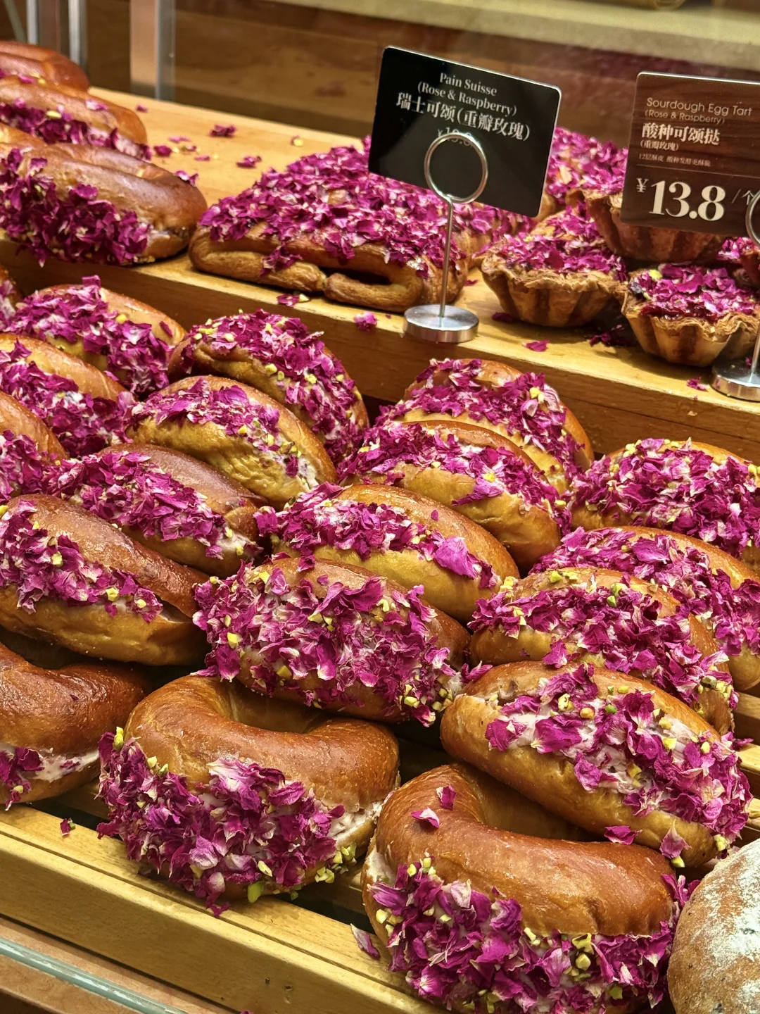 ✅ 招牌必点:玫瑰乳酪贝果,裹满玫瑰花瓣,乳酪酱是那种醇厚质感我超爱!好吃程度:玫瑰贝果>玫瑰蛋挞>吐司系列