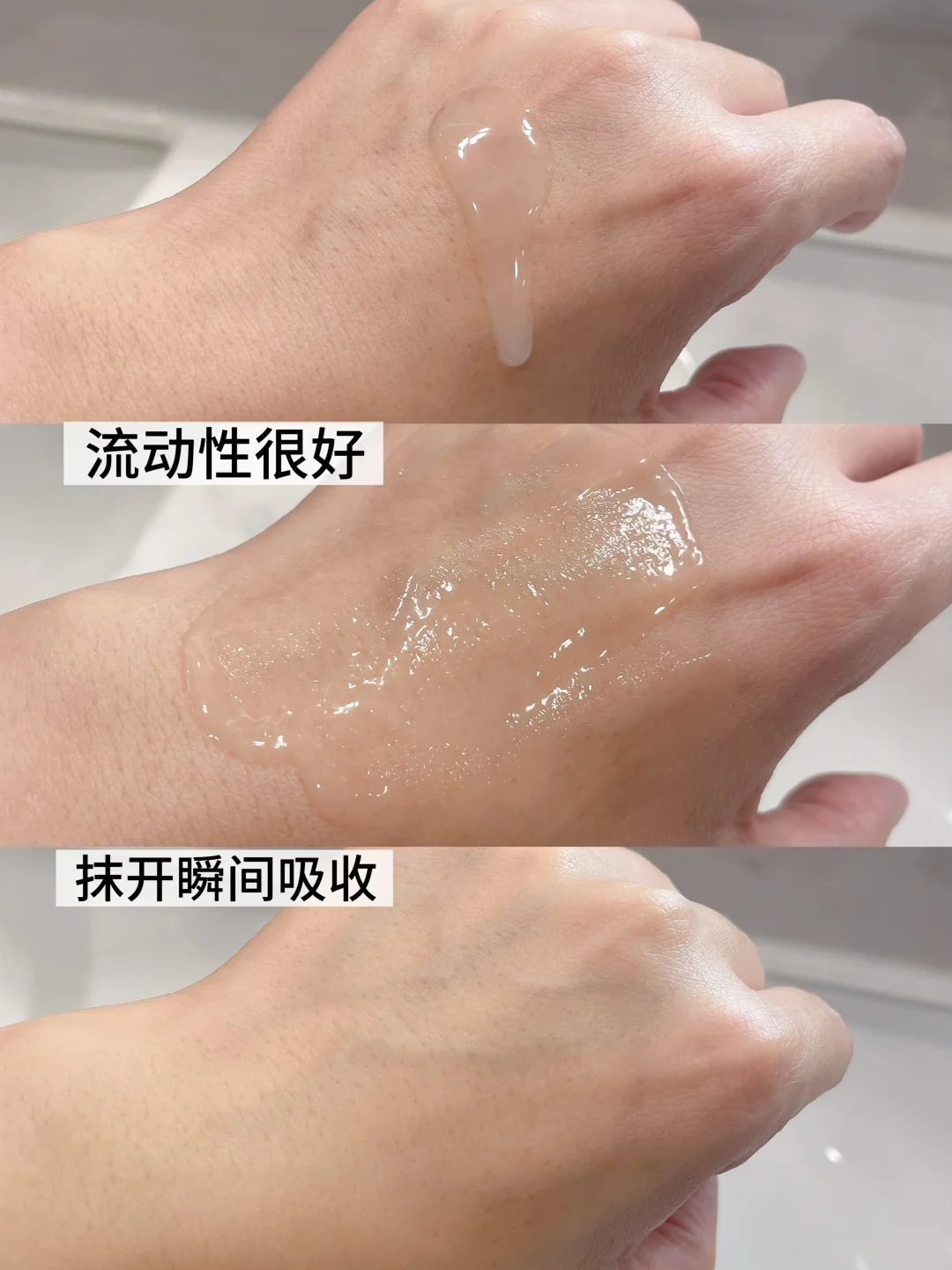 质感也绝了❤ 半透明凝露质地,轻盈水润不黏腻,吸收超快,涂完清爽水润,不闷痘、不卡粉,干混油都适配。