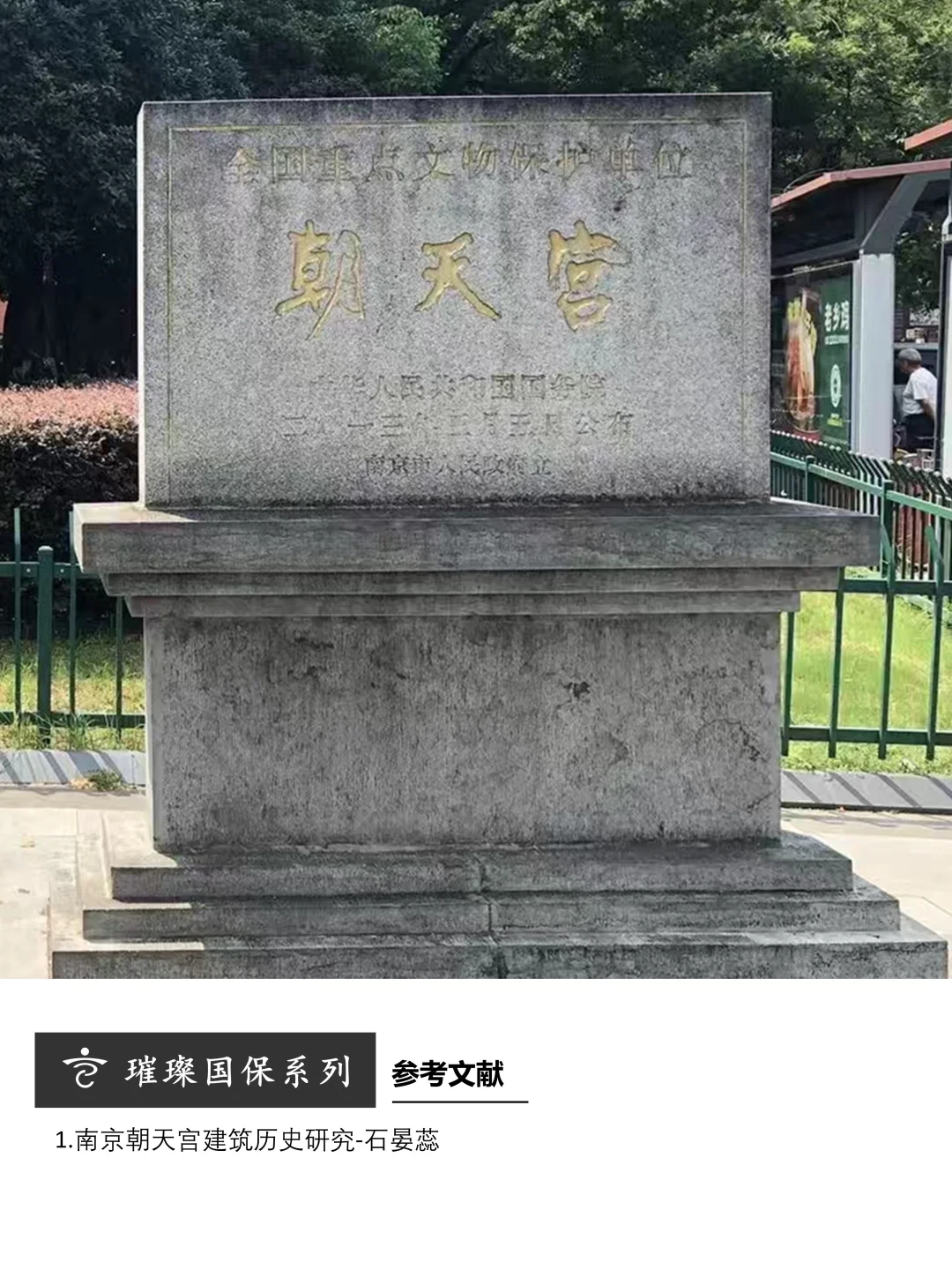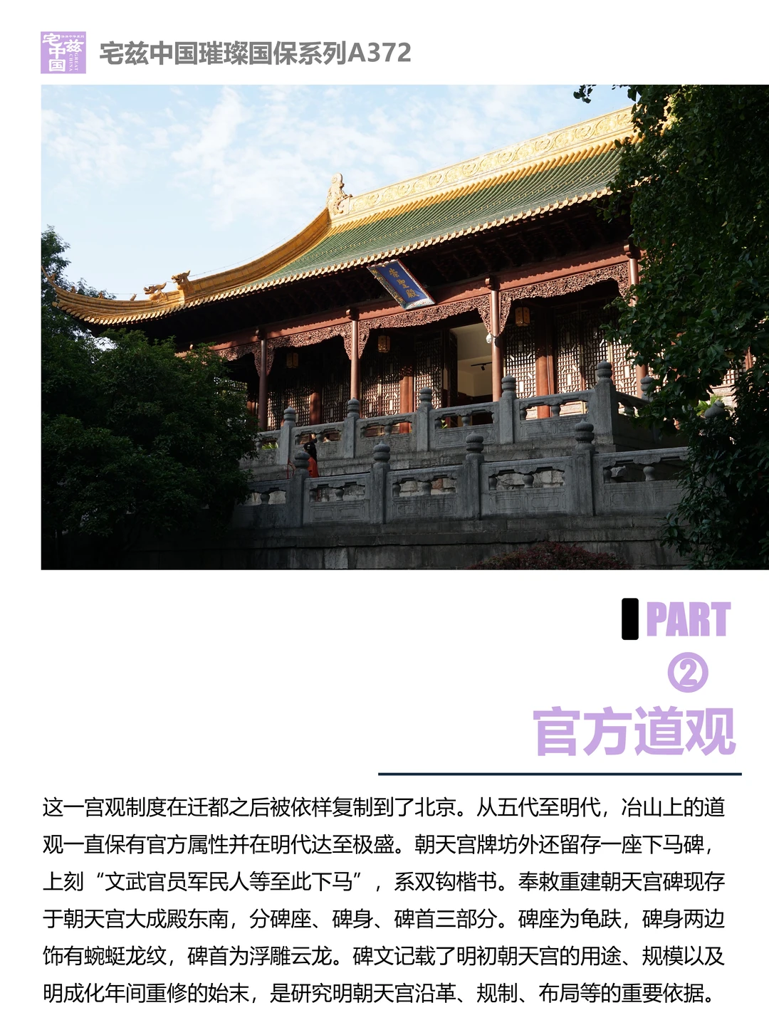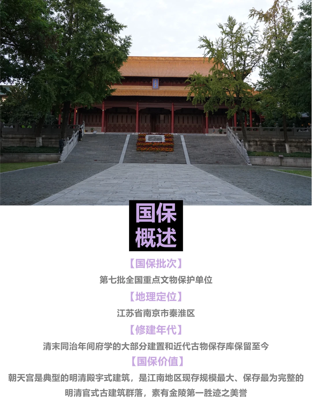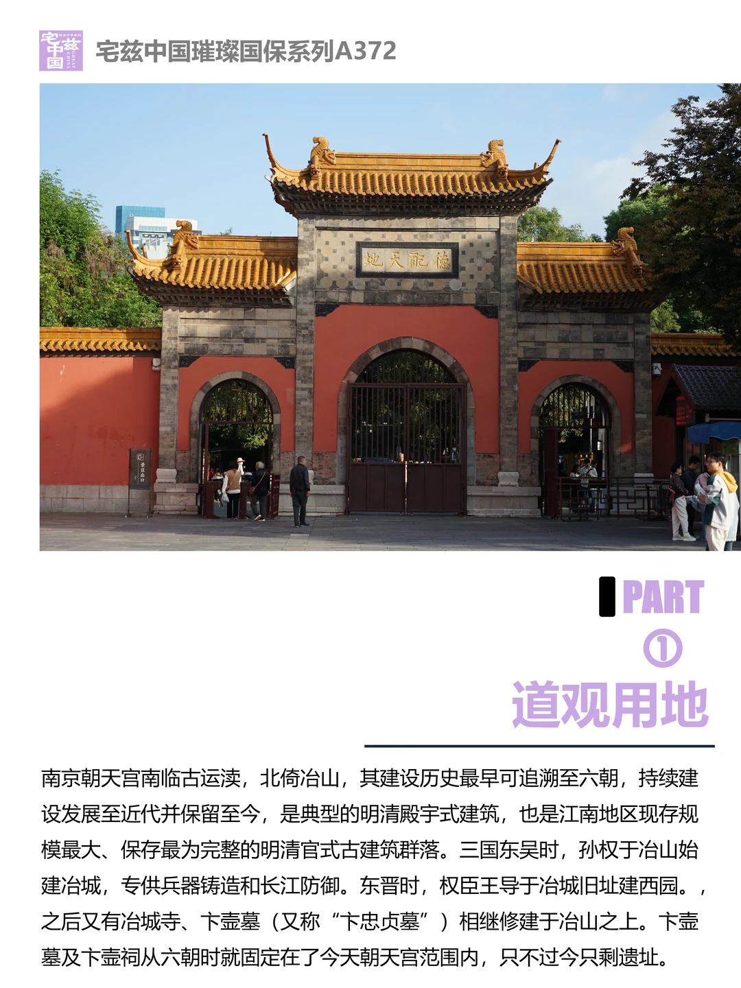 朝天宫北倚冶山,南朝成为道观用地并在明朝迎来发展巅峰。朱元璋改永寿宫为朝天宫,朝天宫成为了集道教管理、斋醮祝釐、大朝习仪职能于一体的京城官方第一道观。同治时期,朝天宫改为江宁府学,结束了自五代以来连续的道观建设,成为了儒学之地。民国时期,国立北平故宫博物院改朝天宫为南京故宫分院,从此朝天宫作为博物馆的功能延续至今。朝天宫作为典型明清殿宇式建筑,是江南地区现存规模最大、保存最完整的明清官式古建筑群落。