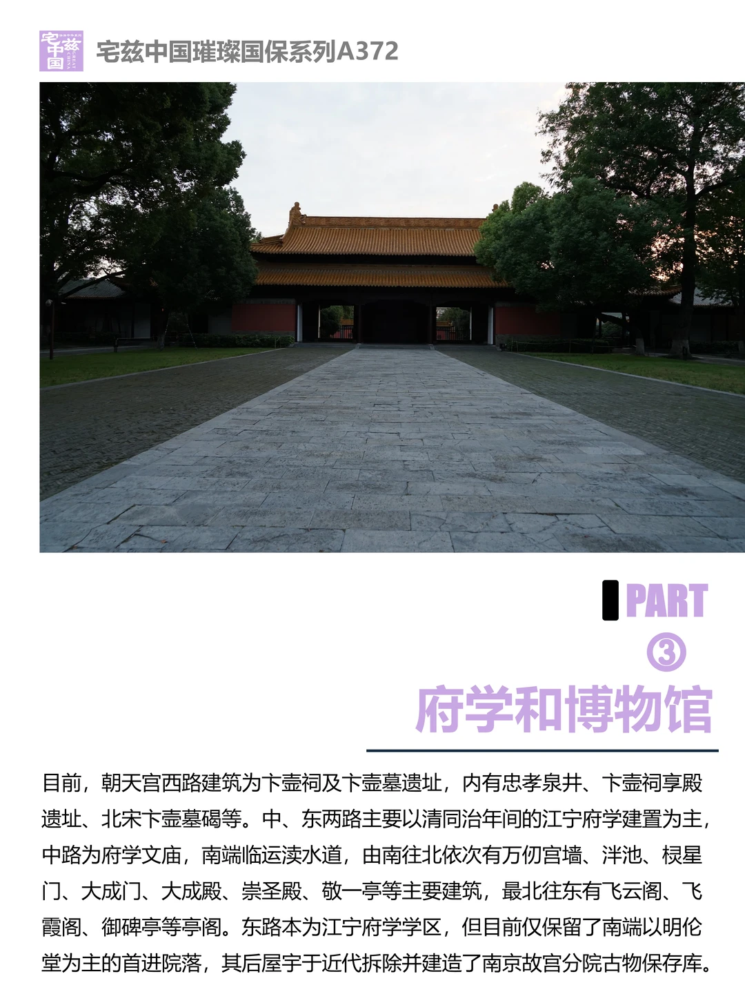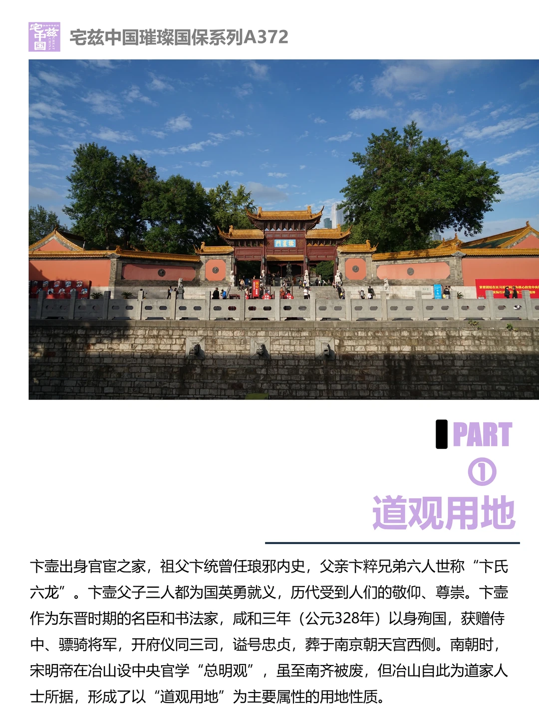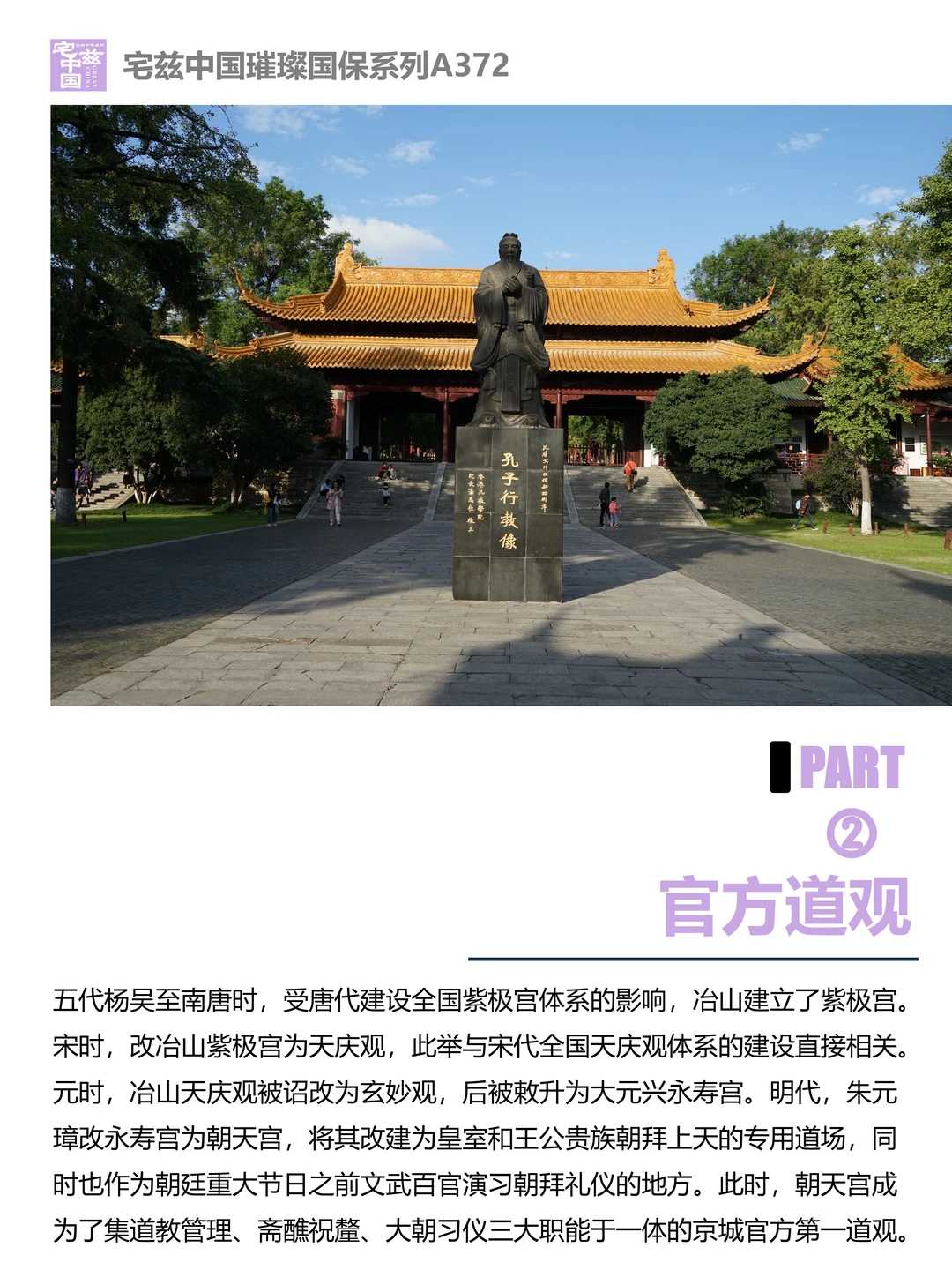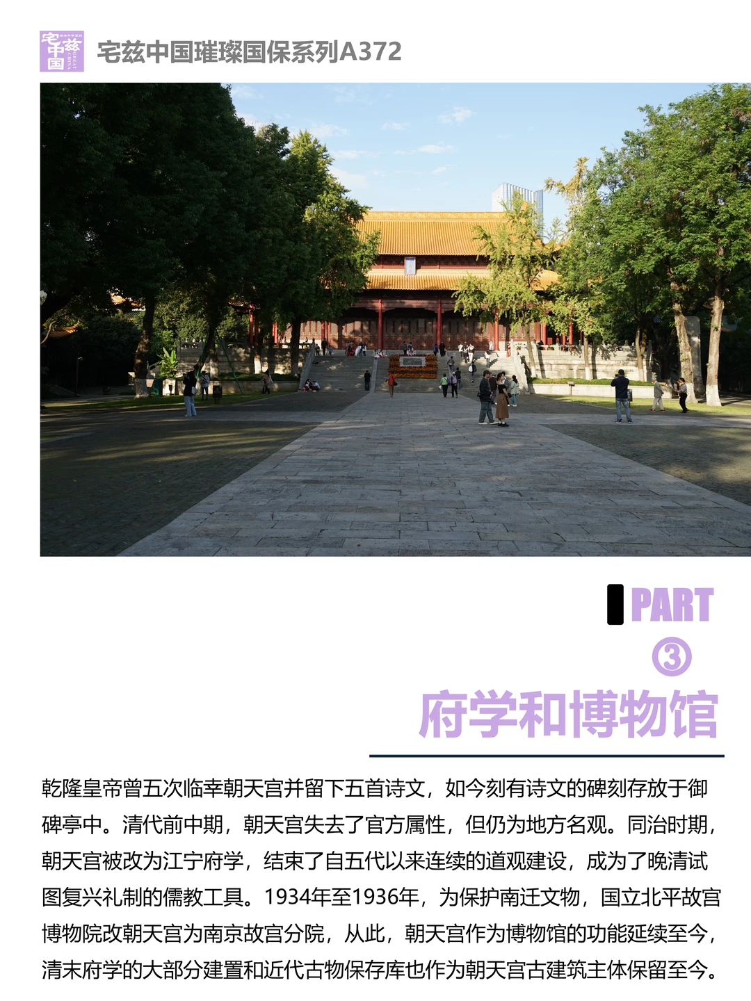 朝天宫北倚冶山,南朝成为道观用地并在明朝迎来发展巅峰。朱元璋改永寿宫为朝天宫,朝天宫成为了集道教管理、斋醮祝釐、大朝习仪职能于一体的京城官方第一道观。同治时期,朝天宫改为江宁府学,结束了自五代以来连续的道观建设,成为了儒学之地。民国时期,国立北平故宫博物院改朝天宫为南京故宫分院,从此朝天宫作为博物馆的功能延续至今。朝天宫作为典型明清殿宇式建筑,是江南地区现存规模最大、保存最完整的明清官式古建筑群落。