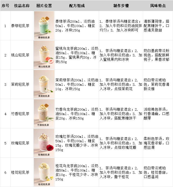 👩🍳制作步骤:1. 茶汤与糖浆混合;2. 加入牛奶和淡奶油;3. 加入冰块,点缀茉莉花