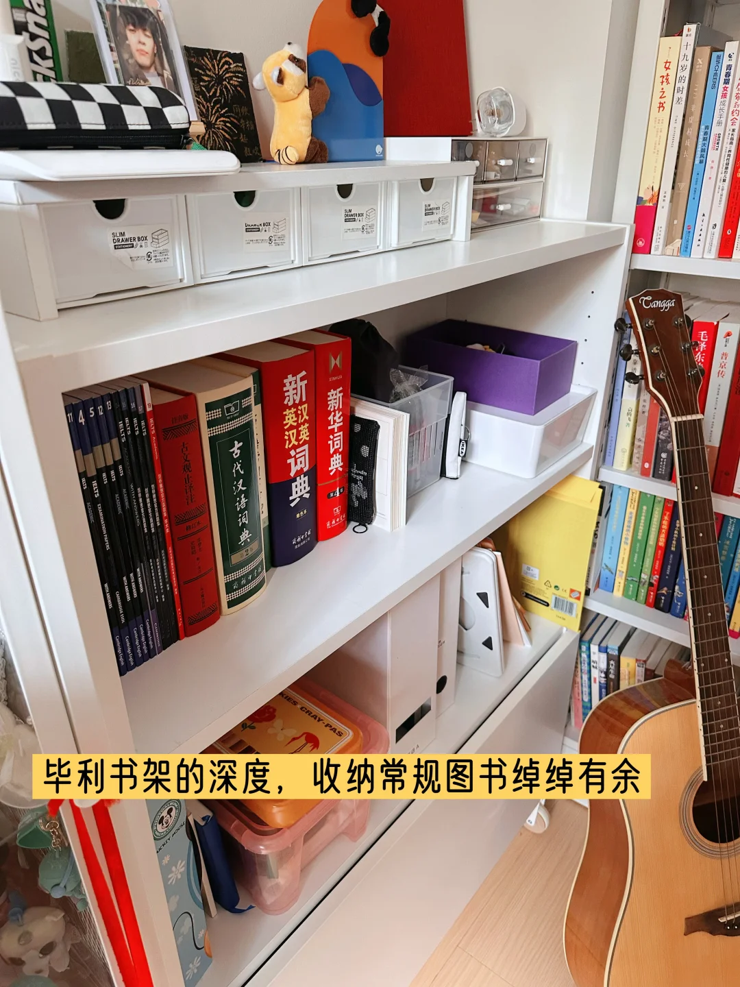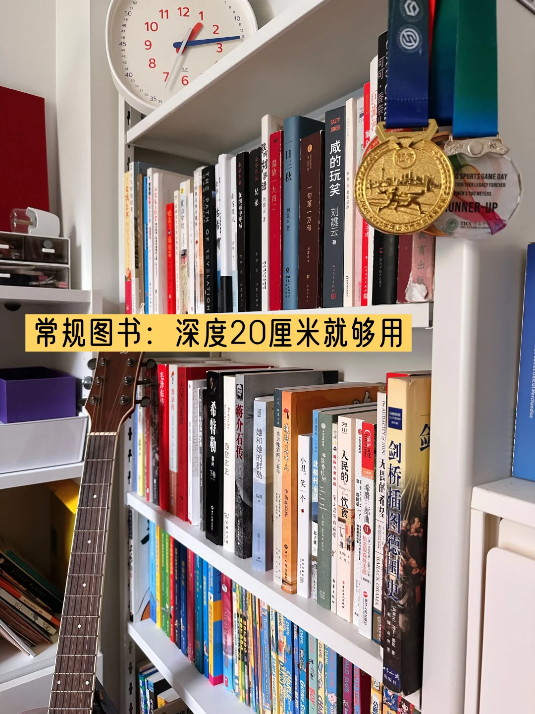 以图片中一名初中生房间的书架为例:深度20厘米的图书馆书架,最趁手。完全不用担心书前面有多余空间、堆上杂物影响取放。