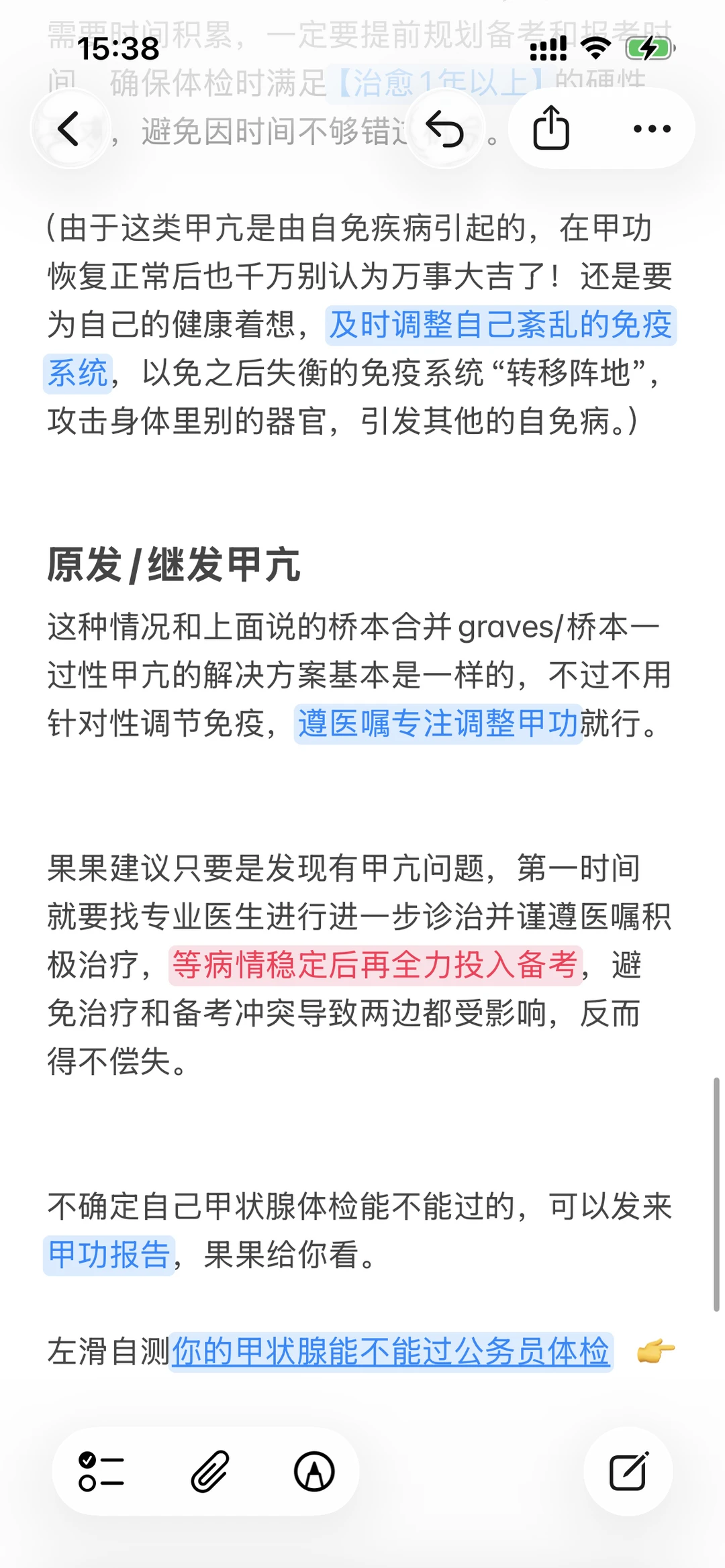果果建议所有准备考公考编的小伙伴,先提前做一个甲状腺检查,如果查出来有甲亢的话一定要优先干预,免得辛辛苦苦备考很久之后,在体检的时候被“卡脖子”。