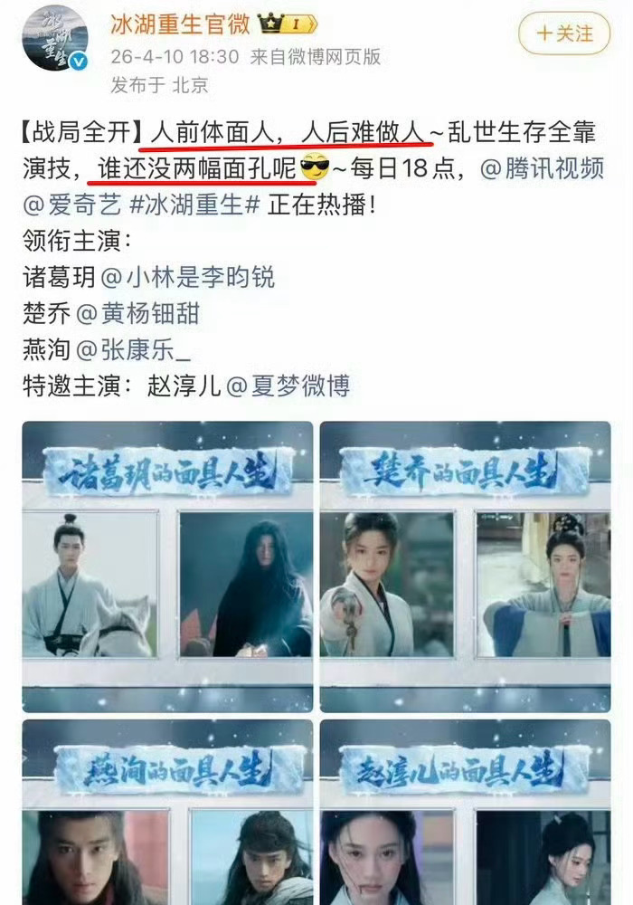 在赵丽颖工作室发了《楚乔传》的幕后采访后,《冰湖重生》官微发文:人前体面人,人后