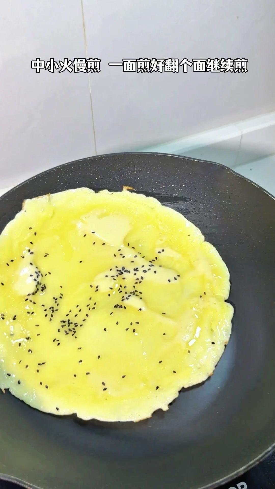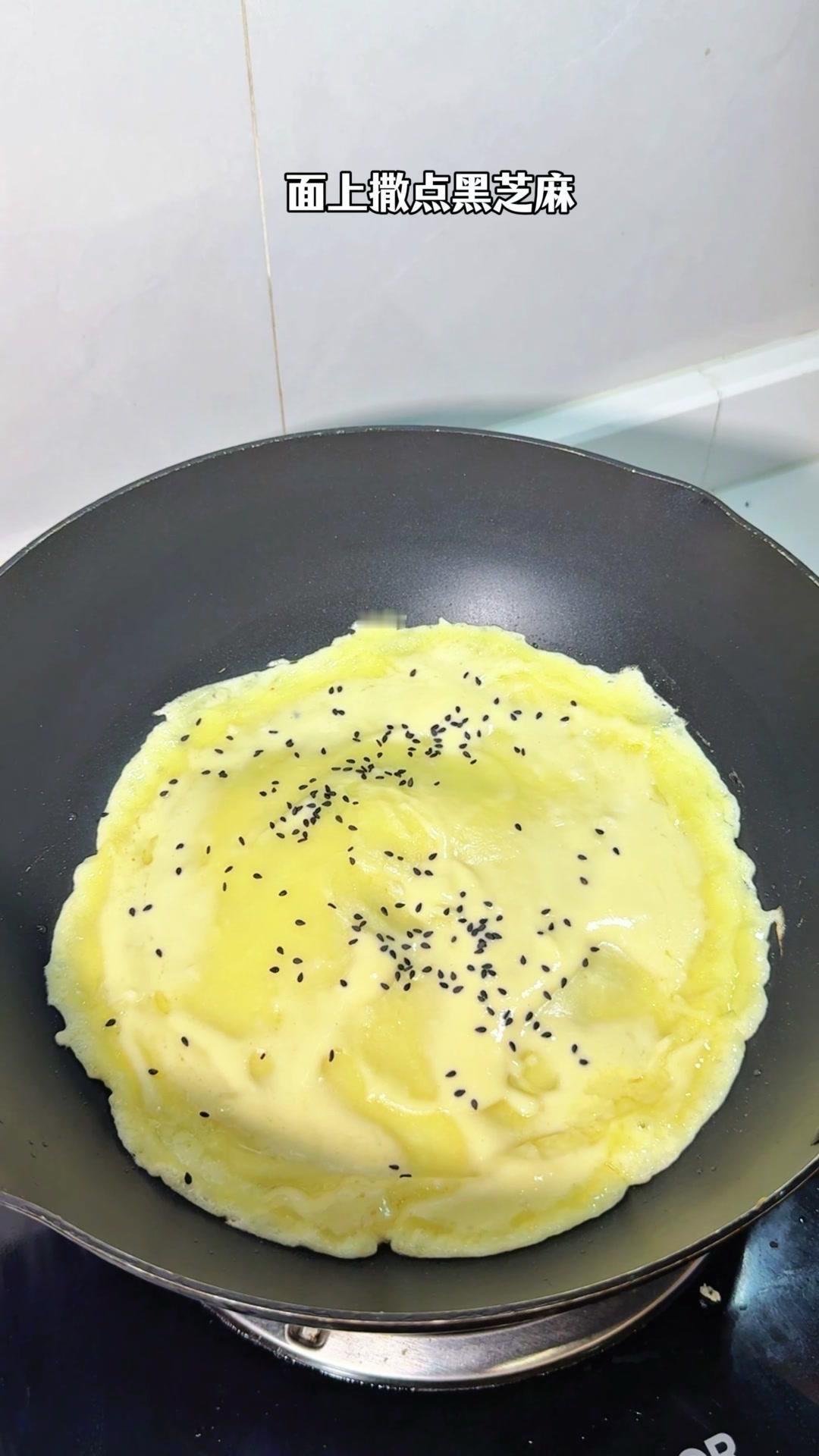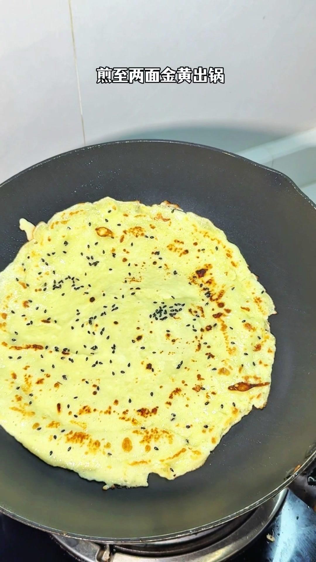 2️⃣煎制步骤:锅中油热后倒入面糊,摊薄摊均匀,撒点黑芝麻增香。中小火慢煎,一面煎好再翻面继续煎,直到两面金黄,麦煎就完成啦~